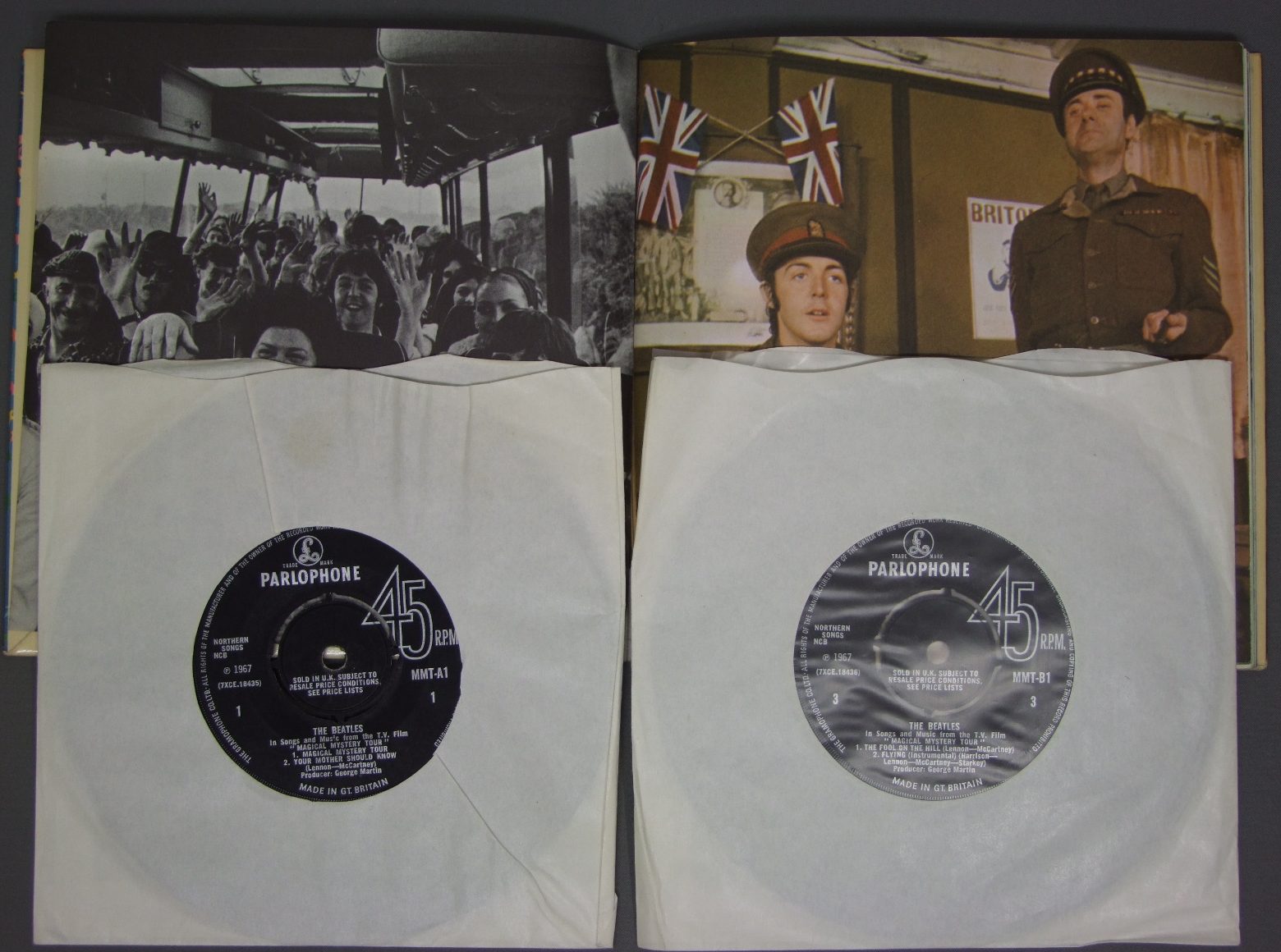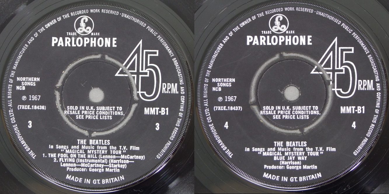 BEATLES/MAGICAL MYSTERY TOUR MONO EP MMT1 製造国:英国盤 / Media:7inchMatrix: -1 / -1 / -1 / -2外観:EX盤の状態:EX- 価格(税込):¥11,000(売約済) 送料 7inch:定形外郵便 360円~LP:定形外郵便 660円~送料は、注文の最終画面で確認頂けます。 > > BEATLES/MAGICAL MYSTERY TOUR MONO EP 外観 (EX)特記事項:背にスレが少し。背の中央よりやや上付近にぶつかり跡有り、表裏ジャケ共にその部分にコーティングの浮き有り。ジャケ表面は全体的にスレやスリキズ、コーティングのヨレシワはあまり無い感じ。見開きのブックレット部分はあまりヨレやよごれ等は無い感じ。13ページ下ヘリに短い切れとヨレ有り。ブルーの歌詞カード部分にシミが少し。インナーは白無地で上縁が波型のタイプ。外観EXの共通説明:ダメージが限定的。中古品としては保存状態がよい方。シミ、ヨゴレ、スレ 少し~軽度。 盤の状態 (EX-)特記事項:薄いスリキズ・スレ軽くある感じ。ほとんどが軽微なものの様子。盤面も黒さが残っています。A2の前半に溝に沿った長めのスレキズがあり、2回転ぐらいノイズが出ます。他は一見してきれいな印象です。モノ針で所々聴いてみましたが、チリノイズ少し〜軽度。綺麗な再生具合でした。音もとてもクリアーでオススメの音質。盤EX-の共通説明:盤面のスリキズが多少有り。音に出そうなものは殆ど無いように見える~さほど気にならないぐらいの軽いプチ数カ所程度。 Tweet それぞれの画像をクリックすると、大きい写真が見られます こちらの商品もお勧めです 5,500円 GEORGE HARRISON / THIRTY THREE & 1/3 5,500円 JOHN LENNON / SHAVED FISH 4,950円 JOHN & YOKO - PLASTIC ONO BANDF / SOME TIME IN NEW YORK CITY 5,500円 GEORGE HARRISON / LIVING IN THE MATERIAL WORLD 5,500円 BEATLES / AT THE HOLLYWOOD BOWL