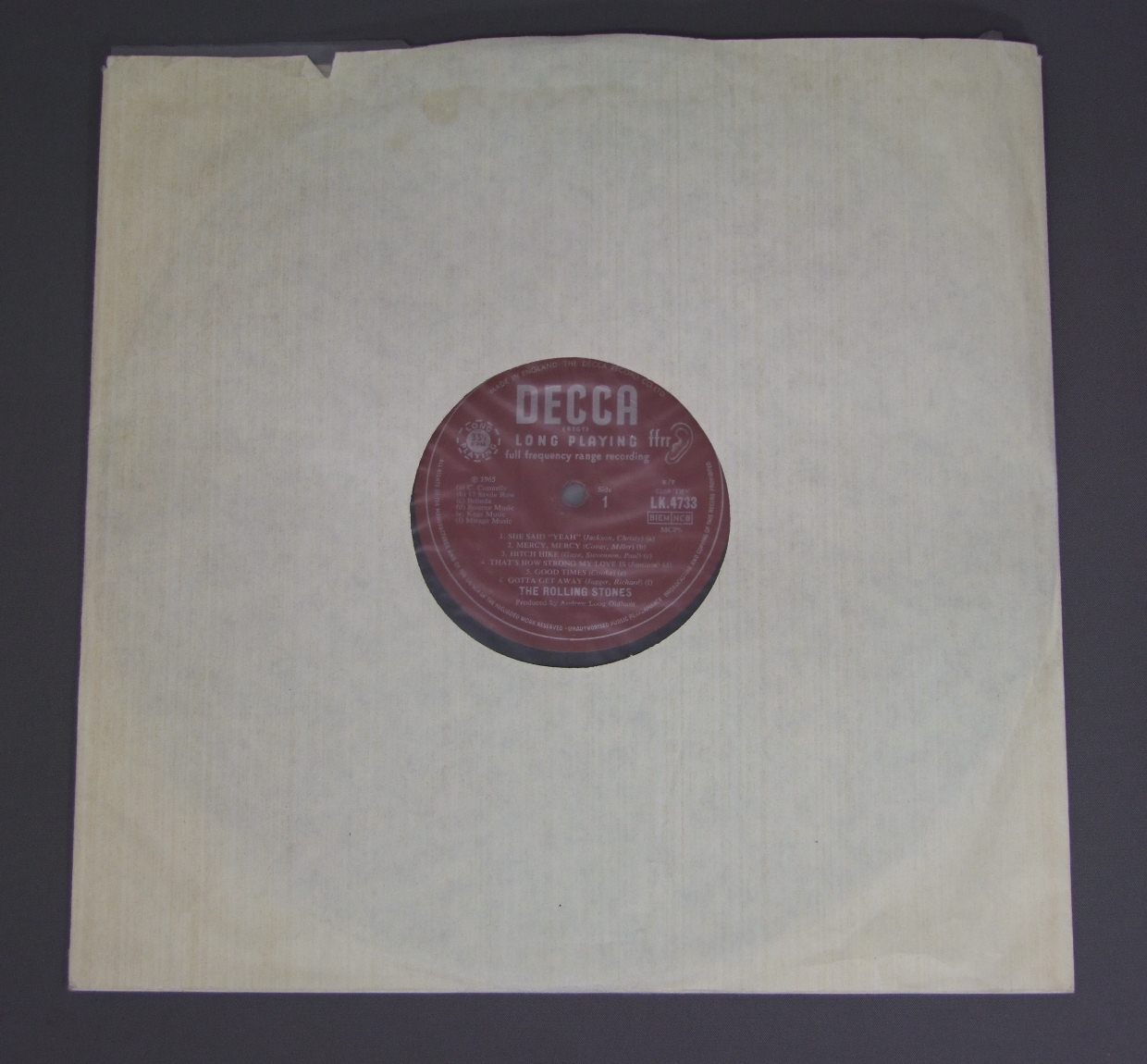 ROLLING STONES/OUT OF OUR HEADS MONO LK4733 製造国:英国盤 / Media:LPMatrix:10B / 1 / I | 10A / 1 /DC外観:EX盤の状態:EX- 価格(税込):¥11,000(売約済) 送料 7inch:定形外郵便 360円~LP:定形外郵便 660円~送料は、注文の最終画面で確認頂けます。 > > ROLLING STONES/OUT OF OUR HEADS MONO 外観 (EX)特記事項:角スレ少々。表ジャケは背に短いヨレシワが少し有りますが、コーティングのヨレシワは全体的に少ない状態。スレやスリキズなども薄い感じです。裏ジャケの左上にステッカー跡。レコード取り出し口付近や底ヘリ付近に薄い日焼け。全体的にはスレやよごれ等は軽い感じ。外観EXの共通説明:ダメージが限定的。中古品としては保存状態がよい方。シミ、ヨゴレ、スレ 少し~軽度。 盤の状態 (EX-)特記事項:薄いスリキズ・スレ軽く〜多少ある感じ。ほとんどが軽微なものの様子で、モノ針なら影響ない程度のもの。曲間など、静かなところを中心にモノ針聴いて見ましたが、チリプチ少ないきれいな再生具合でした。EXに近いオススメの音質。盤EX-の共通説明:盤面のスリキズが多少有り。音に出そうなものは殆ど無いように見える~さほど気にならないぐらいの軽いプチ数カ所程度。 Tweet それぞれの画像をクリックすると、大きい写真が見られます こちらの商品もお勧めです 2,750円 ROLLING STONES / EMOTIONAL RESCUE + POSTEREMOTIONAL RESCUE ポスター付