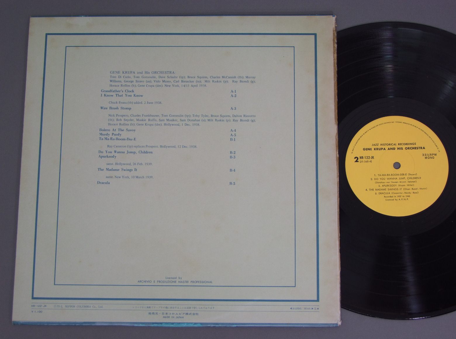 GENE KRUPA/JAZZ HISTORICAL RECORDINGS IN 1937/40 HR122JK 製造国:日本盤 / Media:LP外観:VG+盤の状態:EX+ 価格(税込):¥0(売約済) 送料 7inch:定形外郵便 360円~LP:定形外郵便 660円~送料は、注文の最終画面で確認頂けます。 > > GENE KRUPA/JAZZ HISTORICAL RECORDINGS IN 1937/40 外観 (VG+)特記事項:背や底に割れの補修テープ。解説カード無し。外観VG+の共通説明:ダメージやや有り。シミ、ヨゴレ、スレなど多少~やや多め。 盤の状態 (EX+)特記事項:極薄いスリキズ・スレ少し。一見してきれいな状態です。盤EX+の共通説明:盤面の極薄いスリキズ、スレ少し程度 音に出そうなものは無いように見える(極軽微なソフトティック音は除く)。 Tweet それぞれの画像をクリックすると、大きい写真が見られます こちらの商品もお勧めです 1,320円 SHIRO MICHI道志郎 / WONDERFUL WORLD OF ELECTONEエレクトーンの驚異 770円 ERROLL GARNER-ARCHIE SHEPP etc / SAVOY 100 ALUMS-SPECIAL MENUサヴォイ・スペシャル・メニュー 1,650円 MODERN JAZZ QUARTETモダン・ジャズ・カルテット / CONCORDEコンコルド・デラックス 990円 ISAO SASAKIイサオ・ササキ / AUTUMN SERENADEオータム・セレナーデ 1,320円 SUPER JAZZ TRIOスーパー・ジャズ・トリオ / THE STANDARDザ・スタンダード 1,540円 TEDDY WILSONテデイ・ウイルソン / THE TEDDY WILSONザ・テデイ・ウイルソン 770円 SADAO WATANABE渡辺貞夫 / MY DEAR LIFEマイ・ディア・ライフ 990円 CHARLIE PARKERチャーリー・パーカー / CHARLIE PARKER ON SAVOY VOL4チャーリー・パーカー・オン・サヴォイVOL4