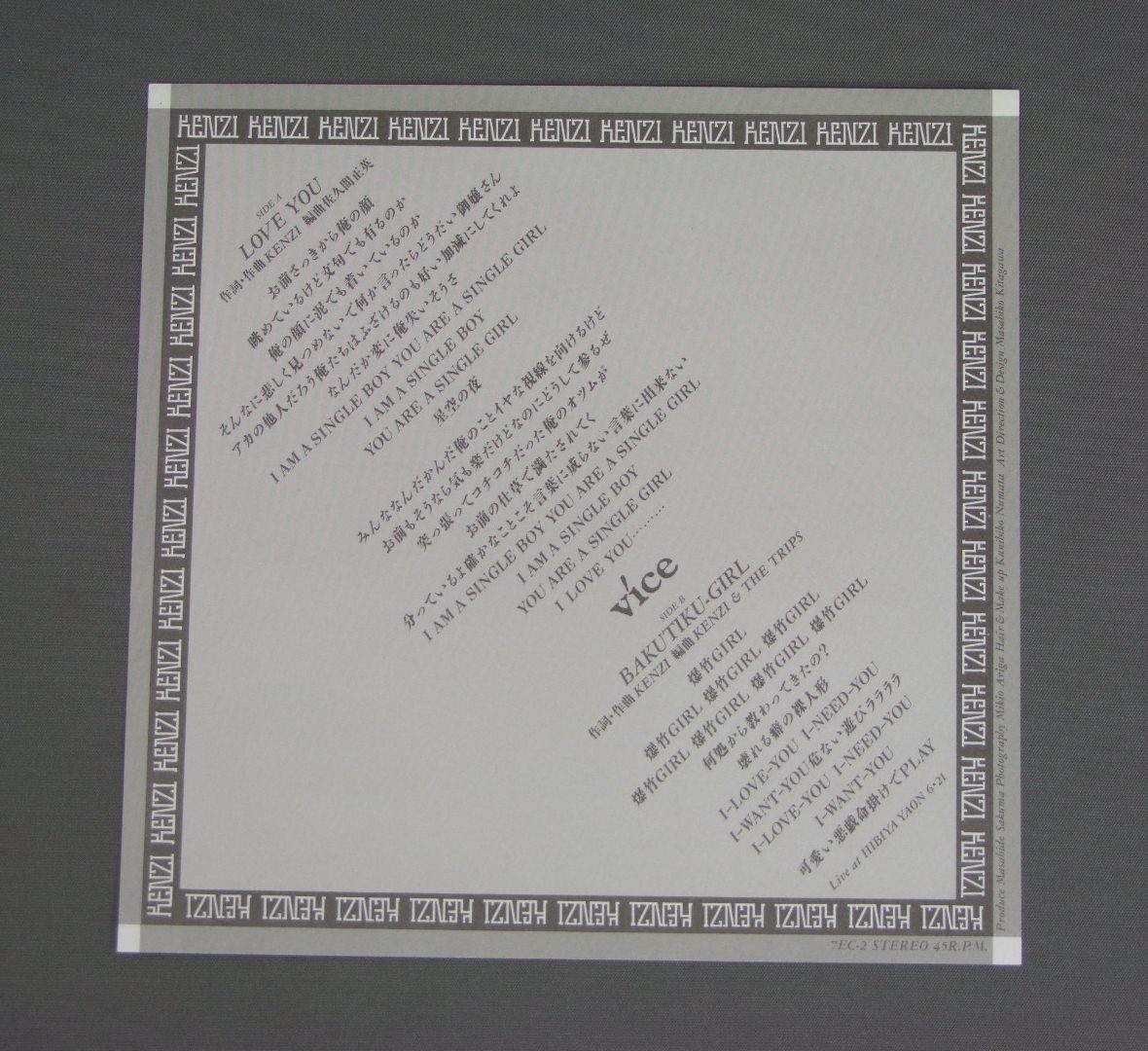 KENZI/LOVE YOU 7EC2 製造国:日本盤 / Media:7inch外観:EX盤の状態:EX+ 価格(税込):¥1,210(売約済) 送料 7inch:定形外郵便 360円~LP:定形外郵便 660円~送料は、注文の最終画面で確認頂けます。 > > KENZI/LOVE YOU 外観 (EX)特記事項:上ヘリでスレ多少有り。外観EXの共通説明:ダメージが限定的。中古品としては保存状態がよい方。シミ、ヨゴレ、スレ 少し~軽度。 盤の状態 (EX+)特記事項:薄いスリキズ・スレ少し。一見してきれいな状態です。盤EX+の共通説明:盤面の極薄いスリキズ、スレ少し程度 音に出そうなものは無いように見える(極軽微なソフトティック音は除く)。 Tweet それぞれの画像をクリックすると、大きい写真が見られます こちらの商品もお勧めです 1,320円 EASTERN ORBITイースタン・オービット / JOURNEY TO UTOPIAジャーニー・トゥ・ユートピア 990円 44 MAGNUM / STREET ROCK`N ROLLERストリートロックンローラー 1,320円 CAROLキャロル / LAST LIVE 1975.4.13燃えつきる - キャロル・ラスト・ライヴ!! 1975.4.13 2,750円 LAUGHIN` NOSEラフィン・ノーズ / LIVE BLACK BOXLIVE BLACK BOX 770円 BOW WOWバウワウ / BOW WOWバウワウ 660円 BOW WOW / WARNING FROM STARDUST 1,320円 GERARDジェラルド / GERARDジェラルド 1,980円 MODSモッズ / CORNER