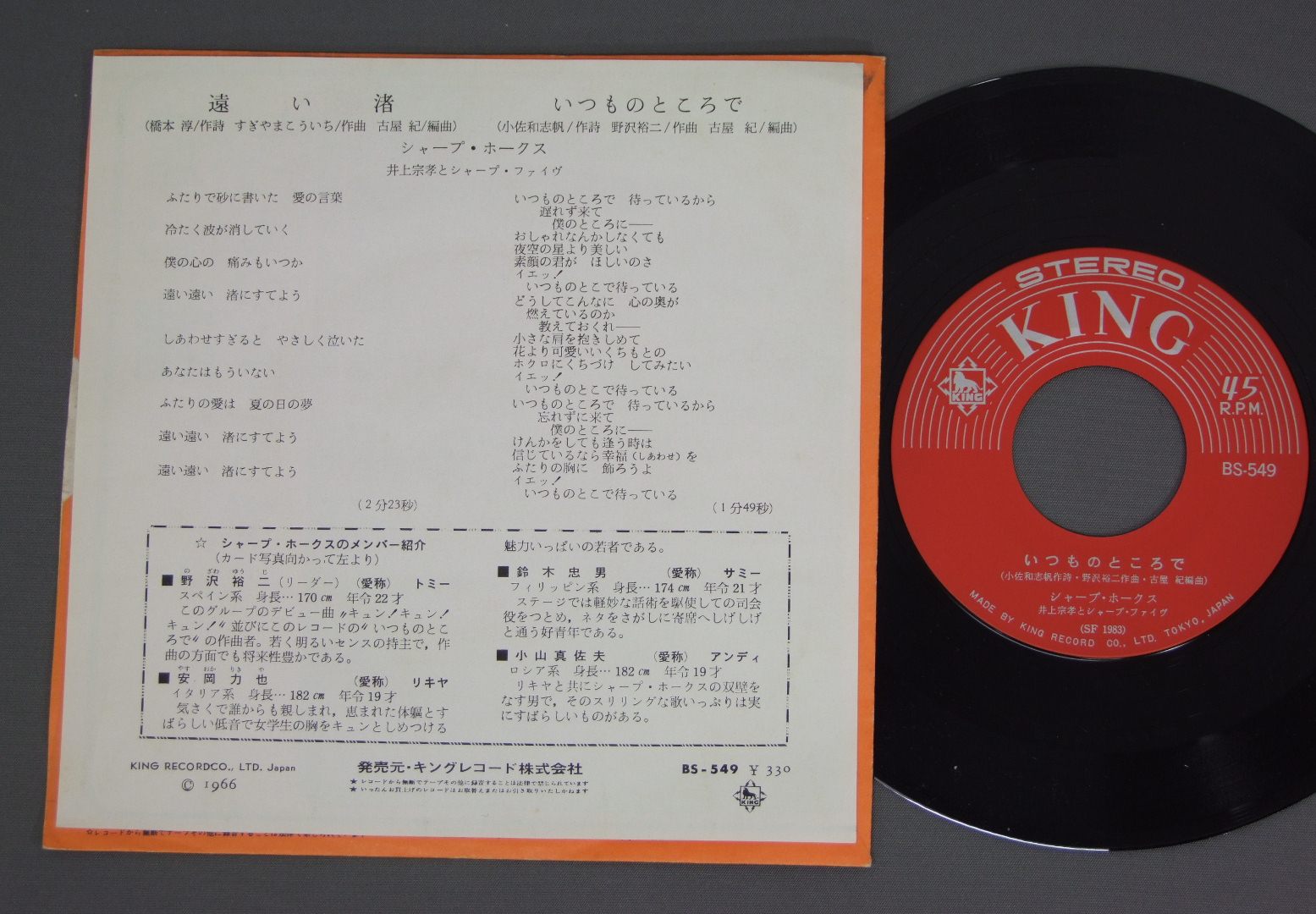 SHARP HAWKSシャープ・ホークス/TOI NAGISA遠い渚 BS549 製造国:日本盤 / Media:7inch外観:EX+盤の状態:EX 価格(税込):¥2,640 送料 7inch:定形外郵便 360円~LP:定形外郵便 660円~送料は、注文の最終画面で確認頂けます。 > > SHARP HAWKS/TOI NAGISA 外観 (EX+)特記事項:特記無し。コンディションリストを参照下さい。外観EX+の共通説明:中古としては美品、一見してきれいでダメージが軽微。シミ、ヨゴレ、スレ有っても僅か~少し。 盤の状態 (EX)特記事項:薄いスリキズ・スレ少しある程度。一見してきれいな状態です。盤EXの共通説明:盤面のスリキズが薄いものが少し~軽度 音に出そうなものは無いように見える(軽微なソフトティック音は除く)。 その他:見本盤 Tweet それぞれの画像をクリックすると、大きい写真が見られます こちらの商品もお勧めです 660円 YUZO KAYAMA加山雄三 / AISURUTOKIHA IMA愛する時は今 3,850円 OXオックス / FIRST ALBUMファースト・アルバム 1,320円 TAKESHI TERAUCHI & THE BUNNYS寺内タケシとザ・バニーズ / LET`S GO CLASSICSレッツ・ゴー運命 2,420円 OXオックス / TELL ME-OX ON STAGE No1テルミー-オックス・オン・ステージ No1 660円 YUZO KAYAMA加山雄三 / 15TH ANNIVERSARY加山雄三1976 武道館ライブ 550円 TAKESHI TERAUCHI & THE BUNNYS寺内タケシとバニーズ / LET`S GO CLASSICSレッツ・ゴー運命 550円 TIGERSタイガース / 10 YEARS ROMANCE十年ロマンス 770円 TIGERSタイガース / HUMAN RENASCENCEヒューマン・ルネッサンス