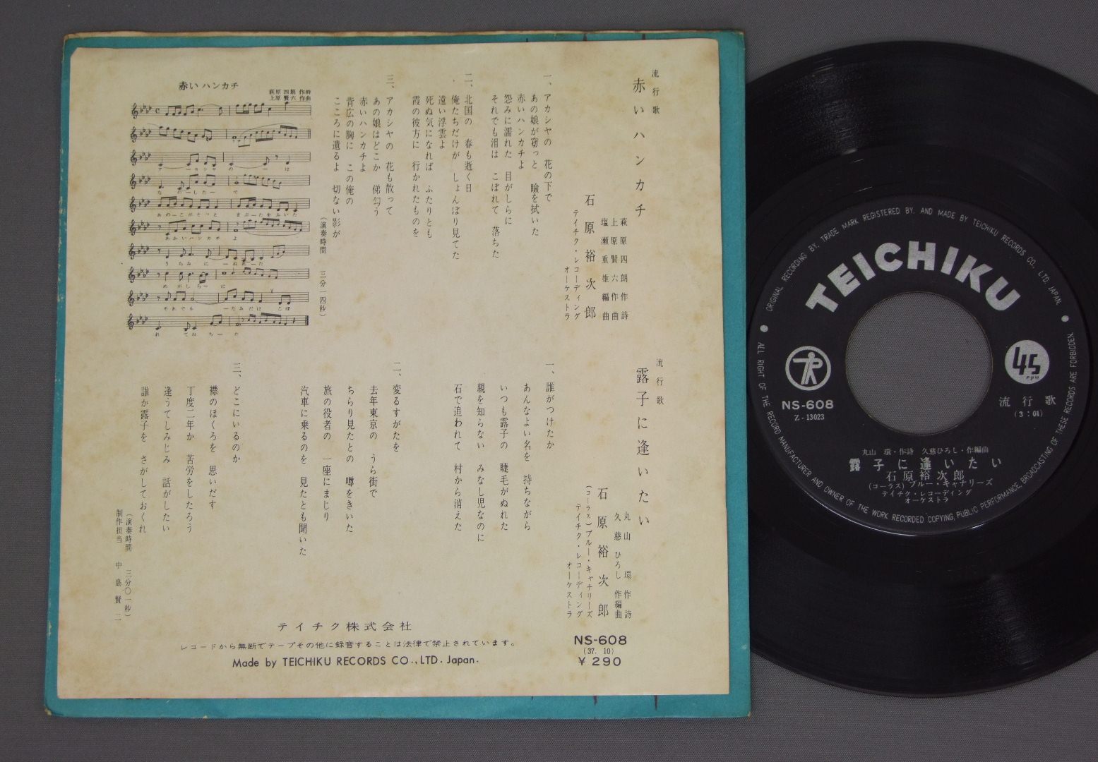 YUJIRO ISHIHARA石原裕次郎/ 赤いハンカチ NS608 製造国:日本盤 / Media:7inch外観:VG+盤の状態:EX- 価格(税込):¥330(売約済) 送料 7inch:定形外郵便 360円~LP:定形外郵便 660円~送料は、注文の最終画面で確認頂けます。 > > YUJIRO ISHIHARA/ 外観 (VG+)特記事項:ヨレは少ない感じですが裏側にシミ多いです。外観VG+の共通説明:ダメージやや有り。シミ、ヨゴレ、スレなど多少~やや多め。 盤の状態 (EX-)特記事項:薄いスリキズ・細かい表面スレ多少ある感じです。プチ出そうな所は少し。軽微なものが中心の様子です。盤EX-の共通説明:盤面のスリキズが多少有り。音に出そうなものは殆ど無いように見える~さほど気にならないぐらいの軽いプチ数カ所程度。 Tweet それぞれの画像をクリックすると、大きい写真が見られます こちらの商品もお勧めです 1,210円 HACHIRO KASUGA春日八郎 / HACHIRO KASUGA HIT ALBUM春日八郎 -魅力のすべて- 880円 上原敏 / 憶い出の任侠・時代歌謡-ポリドール SP原盤 シリーズ 660円 KOJO TSURUTA鶴田浩二 / RED AND BLACK BLUES赤と黒のブルース 770円 YUJIRO ISHIHARA石原裕次郎 / YUJIRO ISHIHARA ORIGINAL BEST石原裕次郎オリジナルベスト 660円 MISAO MATSUBARA松原操 / COLLECTION VOL2第ニ集-浮草の唄 880円 村田英雄-青山和子-安達明 他 / コロムビア歌のハイライト (第五集) 770円 三浦洸一 / ゴールデン・ヒット 660円 AKIRA MATSUDAIRA松平晃 / CIRCUS SONG懐かしの針音 松平晃 サーカスの唄