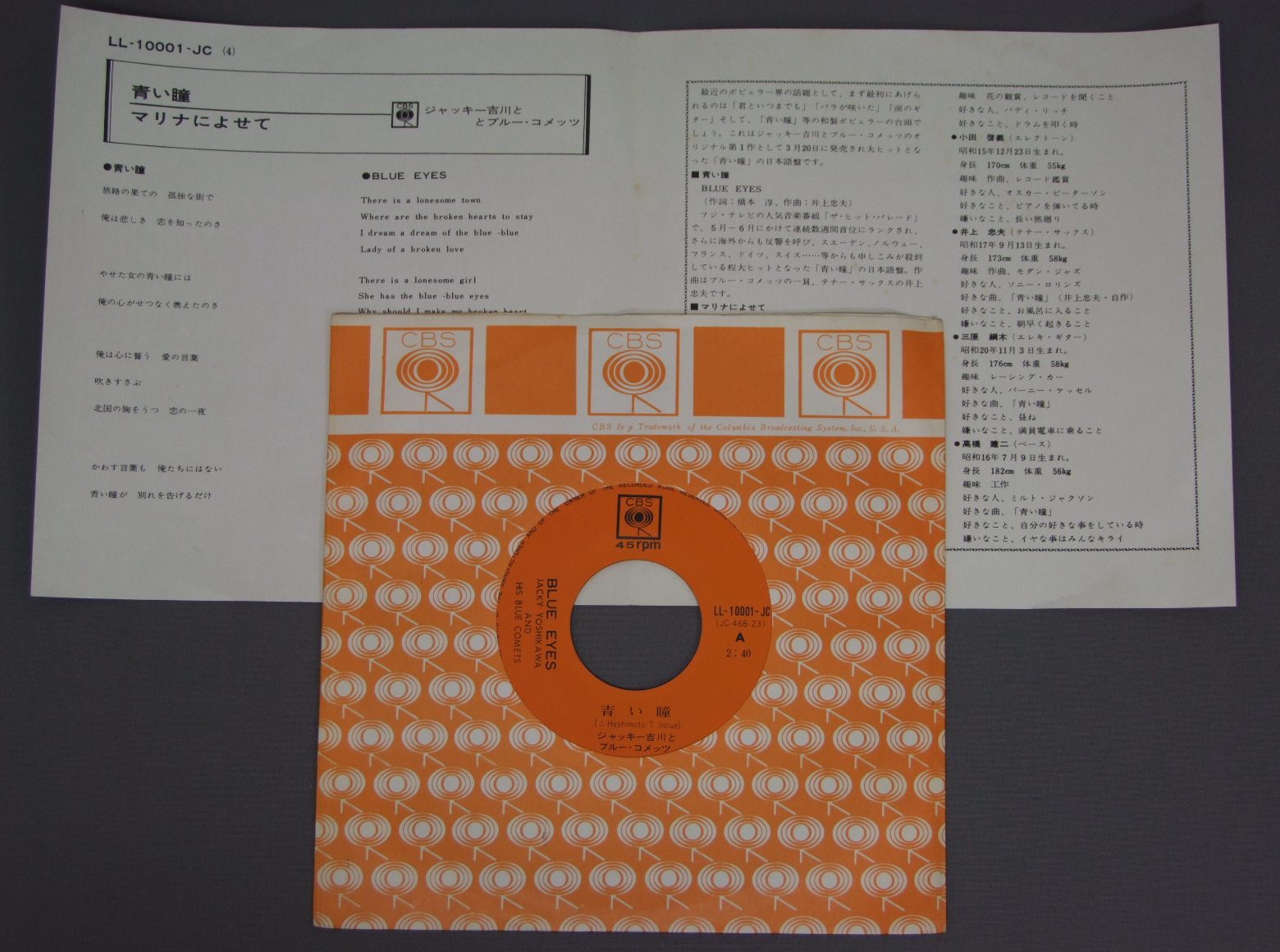 BLUE COMMETSジャッキー吉川とブルー・コメッツ/BLUE EYES青い瞳 日本語盤 LL10001JC 製造国:日本盤 / Media:7inch外観:EX-盤の状態:EX 価格(税込):¥330(売約済) 送料 7inch:定形外郵便 360円~LP:定形外郵便 660円~送料は、注文の最終画面で確認頂けます。 > > BLUE COMMETS/BLUE EYES 外観 (EX-)特記事項:裏ジャケにシミ多いです。外観EX-の共通説明:ダメージ軽度~多少。 中古品としては普通の状態。シミ、ヨゴレ、スレなど軽く~多少。 盤の状態 (EX)特記事項:薄いスリキズ・スレ軽くある感じ。ほとんどが軽微なものの様子です。盤EXの共通説明:盤面のスリキズが薄いものが少し~軽度 音に出そうなものは無いように見える(軽微なソフトティック音は除く)。 その他:※画像では確認できない、上下ヘリ、背表紙、取り出し口を中心に状態表記しております。画像で確認出来る表裏ジャケ、レーベルの状態表記は省いている場合がありますので、そちらの状態は画像でご確認をお願い致します。携帯の方は一度PC等で写真をご確認の上ご入札下さいますよう、お願い申し上げます。 Tweet それぞれの画像をクリックすると、大きい写真が見られます こちらの商品もお勧めです 770円 TIGERSタイガース / HUMAN RENASCENCEヒューマン・ルネッサンス 3,850円 OXオックス / FIRST ALBUMファースト・アルバム 1,210円 WILD ONES加瀬邦彦とワイルドワンズ / ON THE BEACH`82オン・ザ・ビーチ`82 660円 YUZO KAYAMA加山雄三 / 15TH ANNIVERSARY加山雄三1976 武道館ライブ 1,210円 TIGERSタイガース / TIGERS 1982十年ロマンス 770円 YUZO KAYAMA加山雄三 / GOLDEN ALBUMゴールデン・アルバム(あなたと共に)赤盤 550円 TIGERSタイガース / 10 YEARS ROMANCE十年ロマンス 660円 YUZO KAYAMA加山雄三 / AISURUTOKIHA IMA愛する時は今