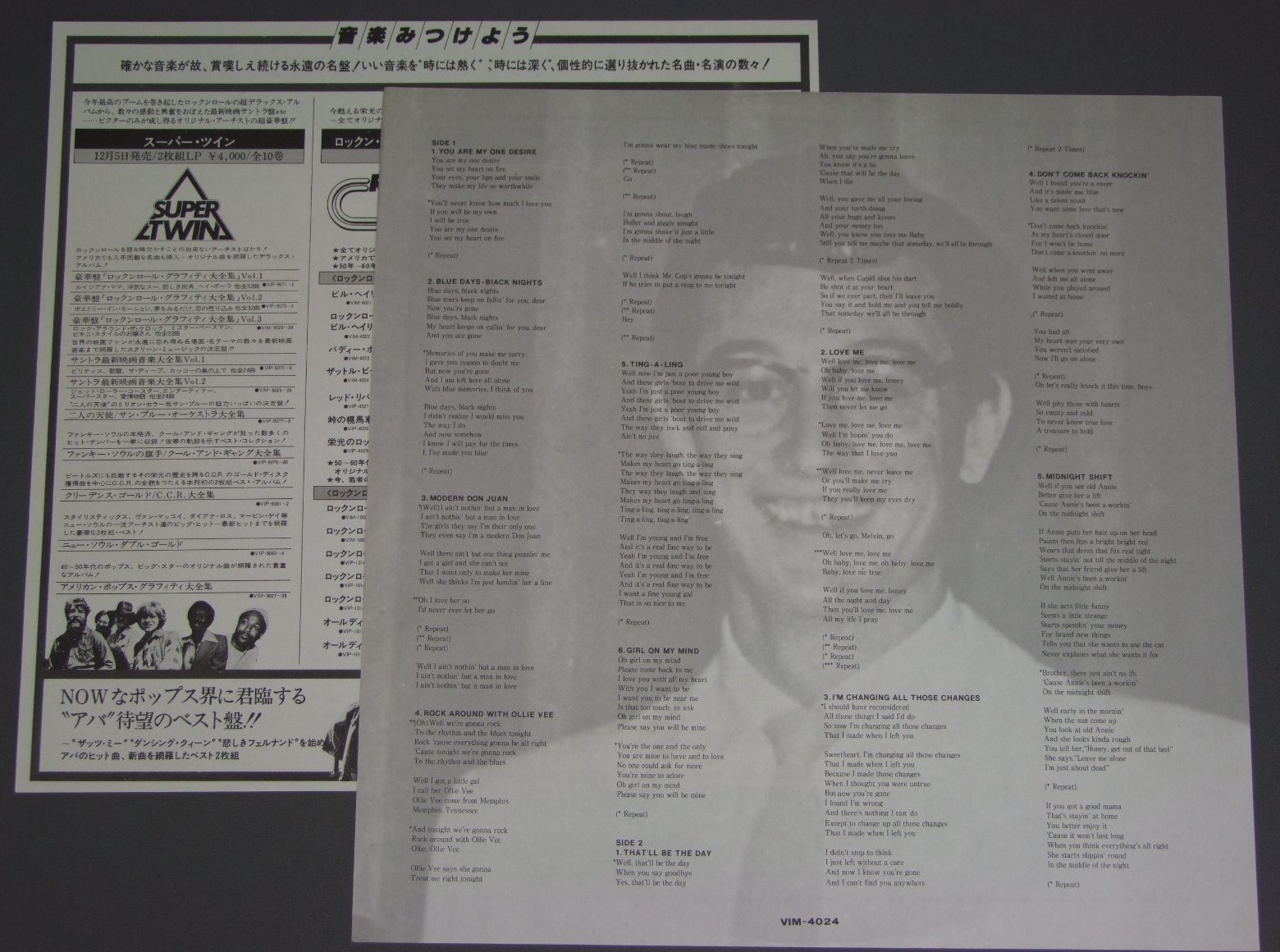 BUDDY HOLLY/THAT`LL BE THE DAY VIM4024 製造国:日本盤 / Media:LP外観:EX+盤の状態:EX+ 価格(税込):¥1,047(売約済) 送料 7inch:定形外郵便 360円~LP:定形外郵便 660円~送料は、注文の最終画面で確認頂けます。 > > BUDDY HOLLY/THAT`LL BE THE DAY 外観 (EX+)特記事項:特記無し。コンディションリストを参照下さい。外観EX+の共通説明:中古としては美品、一見してきれいでダメージが軽微。シミ、ヨゴレ、スレ有っても僅か~少し。 盤の状態 (EX+)特記事項:薄いスリキズ・スレ少し。一見してきれいな状態です。盤EX+の共通説明:盤面の極薄いスリキズ、スレ少し程度 音に出そうなものは無いように見える(極軽微なソフトティック音は除く)。 その他:※画像では確認できない、上下ヘリ、背表紙、取り出し口を中心に状態表記しております。画像で確認出来る表裏ジャケ、レーベルの状態表記は省いている場合がありますので、そちらの状態は画像でご確認をお願い致します。携帯の方は一度PC等で写真をご確認の上ご入札下さいますよう、お願い申し上げます。 Tweet それぞれの画像をクリックすると、大きい写真が見られます こちらの商品もお勧めです 770円 RICK NELSONリック・ネルソン / ALBUM SEVEN BY RICKアルバム・セブン・リック 1,210円 ELVIS PRESLEY / ELVIS IN PERSONプレスリー・イン・パーソン 880円 LETTERMENレターメン / LOVE BOOK愛の世界 1,210円 ELVIS PRESLEY / ON STAGE FEBRUARY 1970プレスリー・オン・ステージ 1970 880円 ELVISエルヴィス・プレスリー / THAT`S THE WAY IT ISこの胸のときめきを/映画「エルヴィス・オン・ステージ」主題歌集 990円 ELVISエルヴィス / THIS IS ELVIS-SELECTIONS FROM THE ORIGINAL MOTION PICUTRE SOUNDTRACK映画 THIS IS ELVIS オリジナル・サウンドトラック 990円 VENTURESベンチャーズ / ROOK`N`ROLL GRAFFITIロックン・ロール・グラフィティ 770円 ELVIS PRESLEYエルヴィス・プレスリー / THAT`S THE WAY IT IS映画 エルヴィス・オン・ステージ