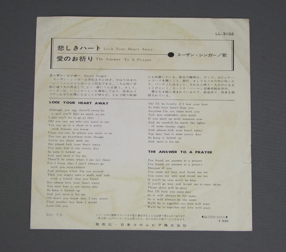 スーザン・シンガー/ 悲しきハート ジャケのみ商品 LL3102 製造国:日本盤 / Media:7inch外観:EX 価格(税込):¥330(売約済) 送料 7inch:定形外郵便 360円~LP:定形外郵便 660円~送料は、注文の最終画面で確認頂けます。 > > / 外観 (EX)特記事項:左端に短い切れ有り。外観EXの共通説明:ダメージが限定的。中古品としては保存状態がよい方。シミ、ヨゴレ、スレ 少し~軽度。 Tweet それぞれの画像をクリックすると、大きい写真が見られます こちらの商品もお勧めです 1,210円 ELVIS PRESLEY / ELVIS AS RECORDED AT MADISON SQUARE GARDENエルヴィス・イン・ニューヨーク 1,210円 ELVIS PRESLEY / ON STAGE FEBRUARY 1970プレスリー・オン・ステージ 1970 990円 VENTURESベンチャーズ / ROOK`N`ROLL GRAFFITIロックン・ロール・グラフィティ 880円 ELVISエルヴィス・プレスリー / THAT`S THE WAY IT ISこの胸のときめきを/映画「エルヴィス・オン・ステージ」主題歌集 1,210円 VENTURES / BEST OF THE VENTURES vol.2 RED VINYL赤盤 1,320円 ELVIS PRESLEY / THAT`S THE WAY IT ISこの胸のときめきを 990円 VENTURESベンチャーズ / IN CHRISTMASイン・クリスマス 990円 ELVISエルヴィス / THIS IS ELVIS-SELECTIONS FROM THE ORIGINAL MOTION PICUTRE SOUNDTRACK映画 THIS IS ELVIS オリジナル・サウンドトラック