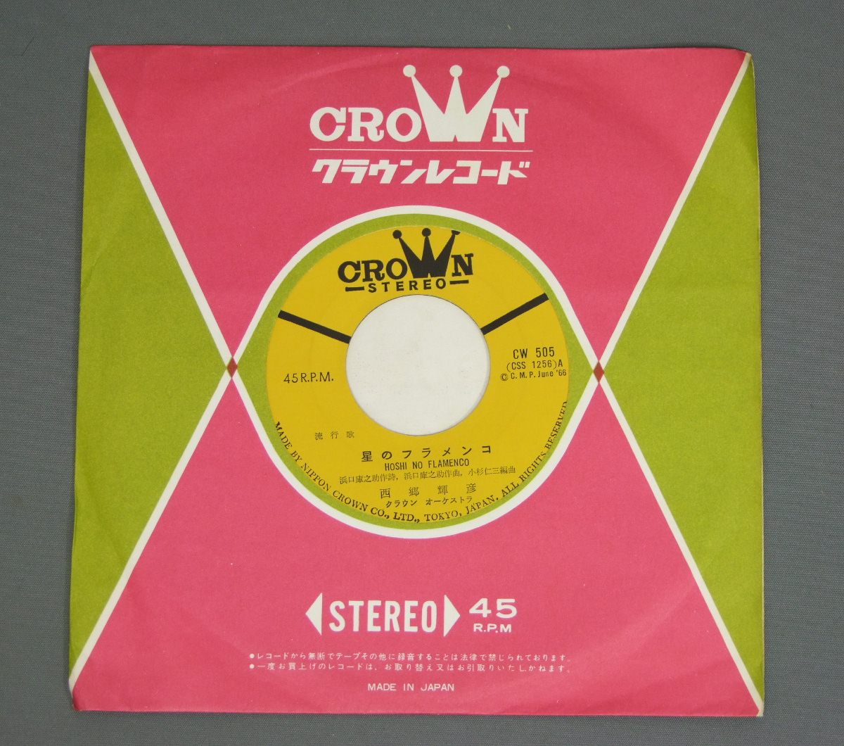 TERUHIKO SAIGO西郷輝彦/ 星のフラメンコ CW505 製造国:日本盤 / Media:7inch外観:EX-盤の状態:EX 価格(税込):¥440(売約済) 送料 7inch:定形外郵便 360円~LP:定形外郵便 660円~送料は、注文の最終画面で確認頂けます。 > > TERUHIKO SAIGO/ 外観 (EX-)特記事項:裏側に薄いシミ。拠れた小有り。外観EX-の共通説明:ダメージ軽度~多少。 中古品としては普通の状態。シミ、ヨゴレ、スレなど軽く~多少。 盤の状態 (EX)特記事項:薄いスリキズ・スレ軽くある感じ。ほとんどが軽微なものの様子です。盤EXの共通説明:盤面のスリキズが薄いものが少し~軽度 音に出そうなものは無いように見える(軽微なソフトティック音は除く)。 Tweet それぞれの画像をクリックすると、大きい写真が見られます こちらの商品もお勧めです 770円 HIRO TSUNODA & JAP`S GAP`Sつのだ・ひろ&ジャップス・ギャップス / 1st ALBUMジャップス・ギャップス・テーマ 770円 TAKURO YOSHIDAよしだたくろう / OTOGIZOSHI伽草子 1,320円 CHA-CHAチャ・チャ / HITOMI NO-NAKA-NO TAKARAJIMA瞳の中の宝島 770円 EMU絵夢 / 2nd ALBUMII 990円 YUKO TOMITAとみたゆう子 / DEUXDEUX (2nd ALBUM) 770円 NOBODYノーバディ / RESTLESS HEARTレストレス・ハート 1,980円 MASAKO OHYA大屋政子 / LIVE CONCERTライブコンサート 1,210円 SHOUGO HAMADA浜田省吾 / KIMIGA JINSEI NO TOKI君が人生の時