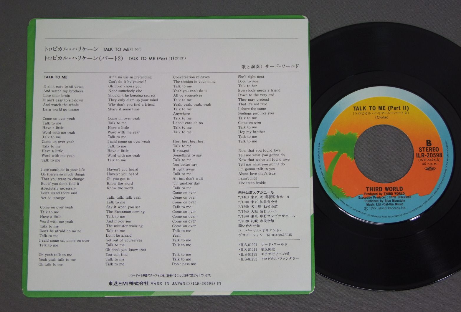 THIRD WORLDサード・ワールド/TALK TO MEトロピカル・ハリケーン ILR20598 製造国:日本盤 / Media:7inch外観:EX盤の状態:EX+ 価格(税込):¥524(売約済) 送料 7inch:定形外郵便 360円~LP:定形外郵便 660円~送料は、注文の最終画面で確認頂けます。 > > THIRD WORLD/TALK TO ME 外観 (EX)特記事項:特記無し。コンディションリストを参照下さい。外観EXの共通説明:ダメージが限定的。中古品としては保存状態がよい方。シミ、ヨゴレ、スレ 少し~軽度。 盤の状態 (EX+)特記事項:極薄いスリキズ・スレ少しだけ。一見してきれいな状態です。盤EX+の共通説明:盤面の極薄いスリキズ、スレ少し程度 音に出そうなものは無いように見える(極軽微なソフトティック音は除く)。 その他:※画像では確認できない、上下ヘリ、背表紙、取り出し口を中心に状態表記しております。画像で確認出来る表裏ジャケ、レーベルの状態表記は省いている場合がありますので、そちらの状態は画像でご確認をお願い致します。携帯の方は一度PC等で写真をご確認の上ご入札下さいますよう、お願い申し上げます。 Tweet それぞれの画像をクリックすると、大きい写真が見られます こちらの商品もお勧めです 880円 THIRD WORLDサード・ワールド / YOU`VE GOT THE POWERラブ・アイランド 990円 MIGHTY DIAMONDSマイティ・ダイアモンズ / EBONY & IVORYエボ二ー & アイボリー 770円 TOURE KUNDAトゥレ・クンダ / TOURE KUNDA LIVEトゥレ・クンダ ライヴ 1,210円 THIRD WORLDサード・ワールド / ALL THE WAY STRONGホット・ワンダーランド 880円 THIRD WORLDサード・ワールド / YOU`VE GOT THE POWERラヴ・アイランド 990円 THIRD WORLDサード・ワールド / YOU`VE GOT THE POWERラヴ・アイランド 1,210円 THIRD WORLDサード・ワールド / SENSE OF PURPOSEセンス・オブ・パーパス