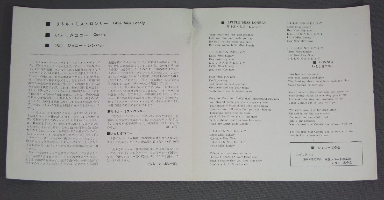 JOHNNY CYMBALジョニー・シンバル/ LITTLE MIS LONELY ( COVER ONLY )リトル・ミス・ロンリー(ジャケのみ) KR1169 製造国:日本盤 / Media:7inch外観:EX- 価格(税込):¥550(売約済) 送料 7inch:定形外郵便 360円~LP:定形外郵便 660円~送料は、注文の最終画面で確認頂けます。 > > JOHNNY CYMBAL/ LITTLE MIS LONELY ( COVER ONLY ) 外観 (EX-)特記事項:背上付近にはがれ。ジャケットのみです。レコードは有りません。外観EX-の共通説明:ダメージ軽度~多少。 中古品としては普通の状態。シミ、ヨゴレ、スレなど軽く~多少。 その他:ジャケットのみです。レコードは有りません。 Tweet それぞれの画像をクリックすると、大きい写真が見られます こちらの商品もお勧めです 1,210円 ELVIS PRESLEY / ELVIS IN PERSONプレスリー・イン・パーソン 990円 VENTURESベンチャーズ / IN CHRISTMASイン・クリスマス 1,210円 ELVIS PRESLEY / ELVIS AS RECORDED AT MADISON SQUARE GARDENエルヴィス・イン・ニューヨーク 1,210円 ELVIS PRESLEY / ON STAGE FEBRUARY 1970プレスリー・オン・ステージ 1970 770円 VARIOUS ARTISTS / YESTERDAY`S HITSイエスタデイズ・ヒッツ 880円 LETTERMENレターメン / LOVE BOOK愛の世界 660円 PAUL ANKAポール・アンカ / BEST OF PAUL ANKAポール・アンカのすべて 990円 VENTURESベンチャーズ / ON STAGE ENCOREオン・ステージ・アンコール