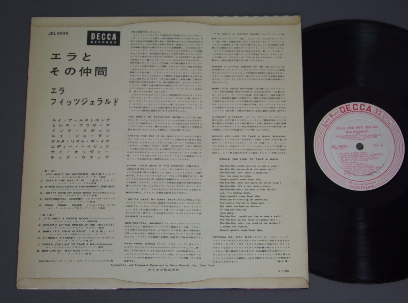 ELLA FITZGERALD/ELLA AND HER FELLASエラとその仲間 ペラジャケ JDL6036 製造国:日本盤 / Media:LP外観:EX-盤の状態:EX- 価格(税込):¥660(売約済) 送料 7inch:定形外郵便 360円~LP:定形外郵便 660円~送料は、注文の最終画面で確認頂けます。 > > ELLA FITZGERALD/ELLA AND HER FELLAS 外観 (EX-)特記事項:多少日焼け感有り。外観EX-の共通説明:ダメージ軽度~多少。 中古品としては普通の状態。シミ、ヨゴレ、スレなど軽く~多少。 盤の状態 (EX-)特記事項:薄いスリキズ・細かい表面スレ多少ある感じ。殆どが軽微なものの様子です。盤EX-の共通説明:盤面のスリキズが多少有り。音に出そうなものは殆ど無いように見える~さほど気にならないぐらいの軽いプチ数カ所程度。 Tweet それぞれの画像をクリックすると、大きい写真が見られます こちらの商品もお勧めです 660円 EDDIE CONDONエディ・コンドン / CONDON A LA CARTEコンドン・ア・ラ・カルト 770円 RALPH SIMONラルフ・サイモン / TIME BEINGタイム・ビーイング 770円 24th STREET BAND24th ストリート・バンド / FEATURING HIRAM BULLOCKフィーチャリング ハイラム・ブロック 1,210円 DEREK SMITHディレク・スミス / BLUESETTEブルースェット 770円 TERUMASA HINO日野皓正 / PYRAMIDピラミッド 1,210円 ERIC DOLPHYエリック・ドルフィー / LAST DATEラスト・レコーディング 1,320円 GATO BARBIERIガトー・バルビエリ / TROPICOトロピコ 990円 MEL POWELLメル・パウエル / OUT ON A LIMBアウト・オン・ア・リム