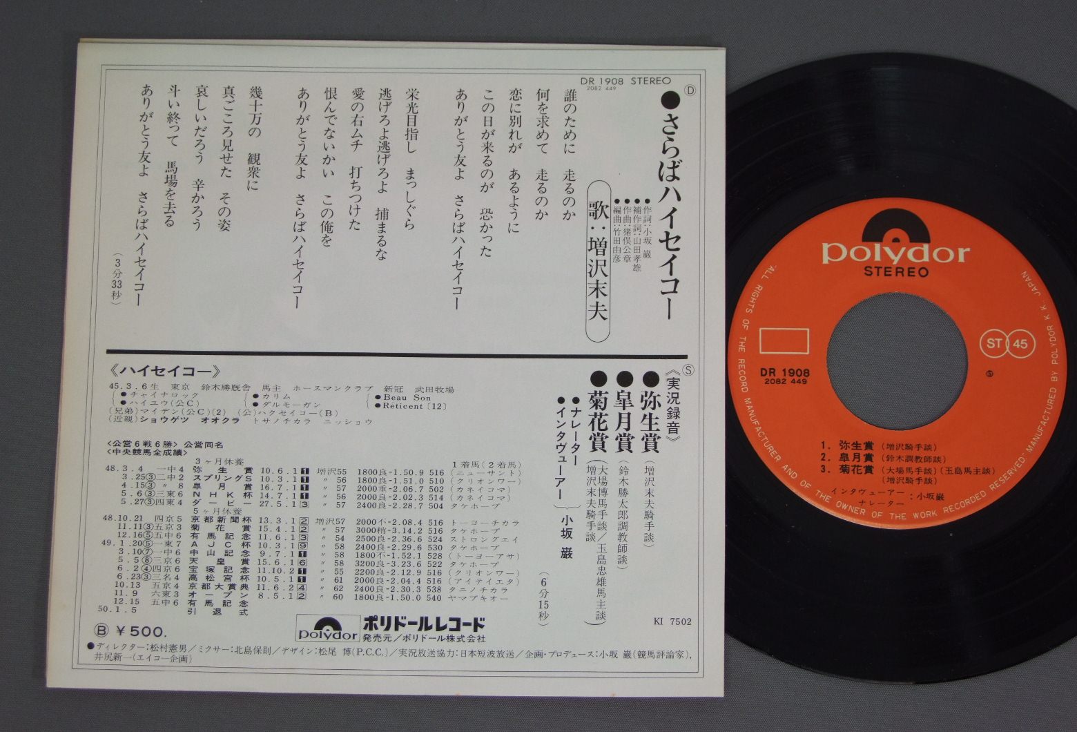 増沢末夫/さらばハイセイコー サイン付 DR1908 製造国:日本盤 / Media:7inch外観:EX盤の状態:EX 価格(税込):¥734(売約済) 送料 7inch:定形外郵便 360円~LP:定形外郵便 660円~送料は、注文の最終画面で確認頂けます。 > > / 外観 (EX)特記事項:裏側に極薄い日焼け少々。外観EXの共通説明:ダメージが限定的。中古品としては保存状態がよい方。シミ、ヨゴレ、スレ 少し~軽度。 盤の状態 (EX)特記事項:薄いスリキズ・スレ軽くある感じ。軽微なものの様子です。盤EXの共通説明:盤面のスリキズが薄いものが少し~軽度 音に出そうなものは無いように見える(軽微なソフトティック音は除く)。 その他:※画像では確認できない、上下ヘリ、背表紙、取り出し口を中心に状態表記しております。画像で確認出来る表裏ジャケ、レーベルの状態表記は省いている場合がありますので、そちらの状態は画像でご確認をお願い致します。携帯の方は一度PC等で写真をご確認の上ご入札下さいますよう、お願い申し上げます。 Tweet それぞれの画像をクリックすると、大きい写真が見られます こちらの商品もお勧めです 770円 JAPANESE PRO-WRESTLINGプロレス / SUPER FIGHTER`S THEMESスーパー・ファイターのテーマ 770円 SUMO SOUNDS呼出し三郎 他 / SUMO-JINKU相撲甚句 1,320円 PRO-WRESTLINGプロレスリング / STAR PRO-WRESTER THEME SONGS各スーパースターテーマ曲集 1,320円 PRO-WRESTLINGプロレスリング / PRO-WRESTLING 2プロレスリング 2 990円 甲子園 / 全国中等学校・高等学校野球大会史