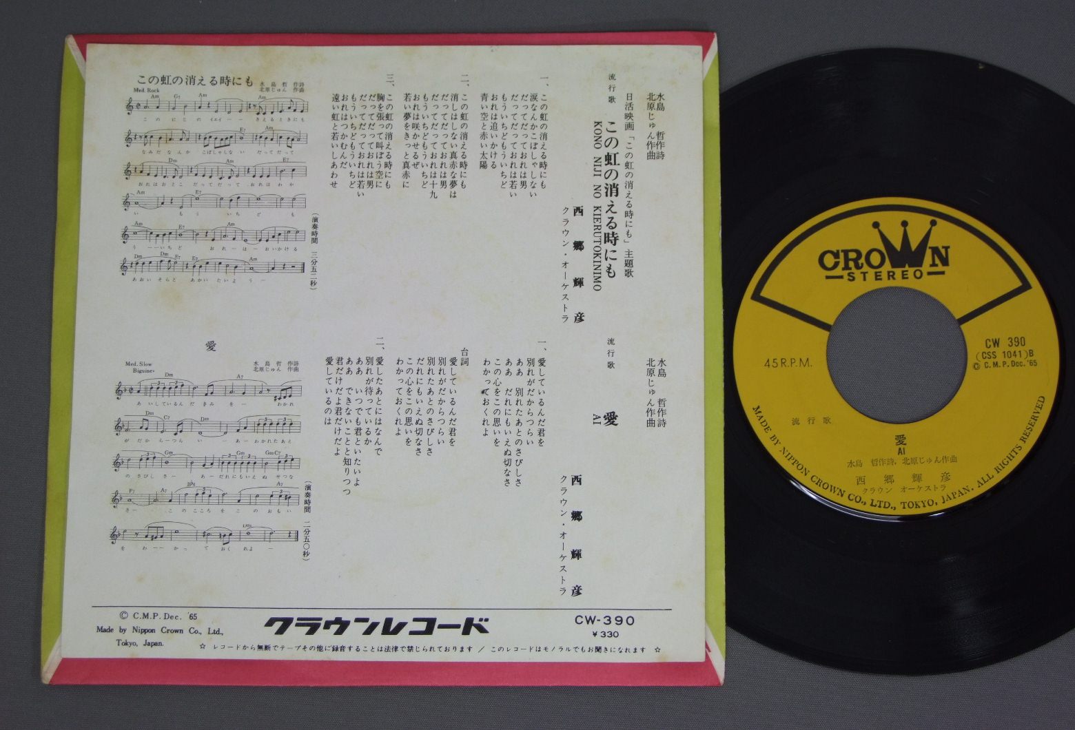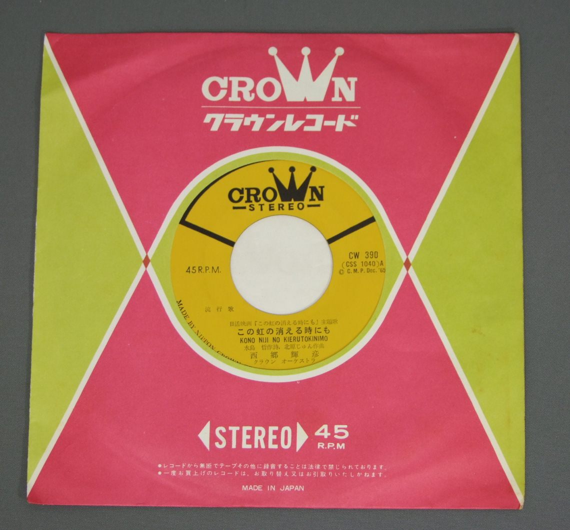 TERUHIKO SAIGO西郷輝彦/ KONONIJINO KIERUTOKINIMOこの虹の消える時にも CW390 製造国:日本盤 / Media:7inch外観:VG+盤の状態:EX- 価格(税込):¥440 送料 7inch:定形外郵便 360円~LP:定形外郵便 660円~送料は、注文の最終画面で確認頂けます。 > > TERUHIKO SAIGO/ KONONIJINO KIERUTOKINIMO 外観 (VG+)特記事項:裏側にシミ。表はそうでも無いです。外観VG+の共通説明:ダメージやや有り。シミ、ヨゴレ、スレなど多少~やや多め。 盤の状態 (EX-)特記事項:薄いスリキズ・細かい表面スレ軽くある感じ。全体的には殆どが軽微なものの様子です。盤EX-の共通説明:盤面のスリキズが多少有り。音に出そうなものは殆ど無いように見える~さほど気にならないぐらいの軽いプチ数カ所程度。 Tweet それぞれの画像をクリックすると、大きい写真が見られます こちらの商品もお勧めです 1,320円 藤山一郎 - 美空ひばり - 高峰三枝子 - 織井茂子 他 / ベスト20 特選-映画主題歌集 (2) 880円 村田英雄-青山和子-安達明 他 / コロムビア歌のハイライト (第五集) 880円 TOSHIRO OKAMOTO岡本敦朗 / SHIROI HANA NO SAKUKORO白い花の咲く頃 1,210円 HACHIRO KASUGA春日八郎 / HACHIRO KASUGA HIT ALBUM春日八郎 -魅力のすべて- 880円 YUKIO HASHI橋幸夫 / FROM ITAKOGASA TO MUHYO黄金の声/潮来笠から霧氷まで 770円 HIBARI MISORA美空ひばり / 1932-35芸能生活30周年記念 歌謡曲50年 第2集 ( 昭和7- 10年) 550円 HISAO ITO伊藤久男 / BEST ALBUM懐しの歌声 伊藤久男と共に 880円 KEN TSUMURA津村謙 / KAYO ALBUM津村謙歌謡アルバム