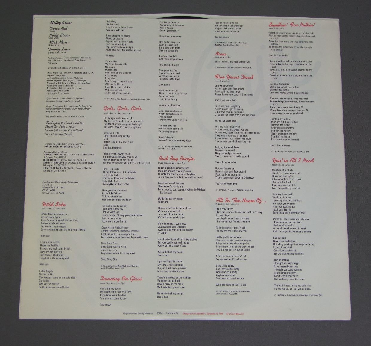 MOTLEY CRUE/GIRS GIRLS GIRLS 9 00725-1 製造国:米国盤 / Media:LP外観:EX+盤の状態:EX- 価格(税込):¥990(売約済) 送料 7inch:定形外郵便 360円~LP:定形外郵便 660円~送料は、注文の最終画面で確認頂けます。 > > MOTLEY CRUE/GIRS GIRLS GIRLS 外観 (EX+)特記事項:インナーは両サイドで抜け有り。外観EX+の共通説明:中古としては美品、一見してきれいでダメージが軽微。シミ、ヨゴレ、スレ有っても僅か~少し。 盤の状態 (EX-)特記事項:薄いスリキズ・スレ軽くある感じ。殆どが軽微なものの様子です。少しソリが有り、軽く針が動きますが、プレイに影響ない程度のようです。盤EX-の共通説明:盤面のスリキズが多少有り。音に出そうなものは殆ど無いように見える~さほど気にならないぐらいの軽いプチ数カ所程度。 その他:※画像では確認できない、上下ヘリ、背表紙、取り出し口を中心に状態表記しております。画像で確認出来る表裏ジャケ、レーベルの状態表記は省いている場合がありますので、そちらの状態は画像でご確認をお願い致します。携帯の方は一度PC等で写真をご確認の上ご入札下さいますよう、お願い申し上げます。 Tweet それぞれの画像をクリックすると、大きい写真が見られます こちらの商品もお勧めです 1,540円 SAMSON / SURVIVORS 1,100円 ARASKA / HEART OF THE STORM 1,320円 TONY MACALPINE / EDGE OF INSANITY 880円 SAMMY HAGAR / SAMMY HAGAR 1,650円 HELIX / NO REST FOR THE WICKED 770円 SCHON & HAMMER / HERE TO STAY 1,760円 QUIET RIOT / CONDITION CRITICAL 770円 707 / MEGA FORCE7