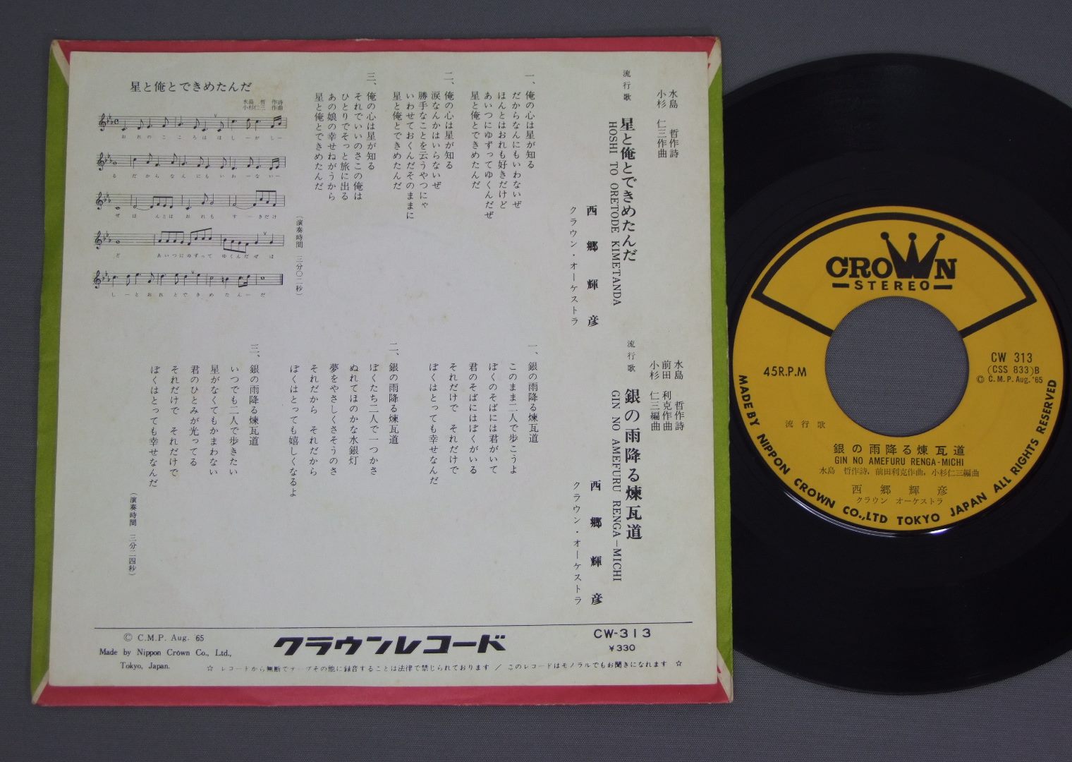 TERUHIKO SAIGO西郷輝彦/ 星と俺とできめたんだ CW313 製造国:日本盤 / Media:7inch外観:EX-盤の状態:EX+ 価格(税込):¥330(売約済) 送料 7inch:定形外郵便 360円~LP:定形外郵便 660円~送料は、注文の最終画面で確認頂けます。 > > TERUHIKO SAIGO/ 外観 (EX-)特記事項:裏側に薄いシミ多少有り。外観EX-の共通説明:ダメージ軽度~多少。 中古品としては普通の状態。シミ、ヨゴレ、スレなど軽く~多少。 盤の状態 (EX+)特記事項:極薄いスリキズ・スレ少し。一見してきれいな状態です。盤EX+の共通説明:盤面の極薄いスリキズ、スレ少し程度 音に出そうなものは無いように見える(極軽微なソフトティック音は除く)。 Tweet それぞれの画像をクリックすると、大きい写真が見られます こちらの商品もお勧めです 660円 CHIEKO SATOH佐藤千夜子 / BEST COLLECTIONオリジナル原盤による懐しの歌声シリーズ4 東京行進曲 1,210円 KEIICHIRO AKAGI赤木圭一郎 / EIEN-NO-TONY永遠のトニー 赤木圭一郎絶唱集 770円 HIBARI MISORA美空ひばり / 1932-35芸能生活30周年記念 歌謡曲50年 第2集 ( 昭和7- 10年) 660円 MISAO MATSUBARA松原操 / COLLECTION VOL2第ニ集-浮草の唄 660円 AKIRA MATSUDAIRA松平晃 / CIRCUS SONG懐かしの針音 松平晃 サーカスの唄 880円 TOSHIRO OKAMOTO岡本敦朗 / SHIROI HANA NO SAKUKORO白い花の咲く頃 1,210円 高峰秀子-橋幸夫 他 / 続 日本流行歌史 1,320円 藤山一郎 - 美空ひばり - 高峰三枝子 - 織井茂子 他 / ベスト20 特選-映画主題歌集 (2)