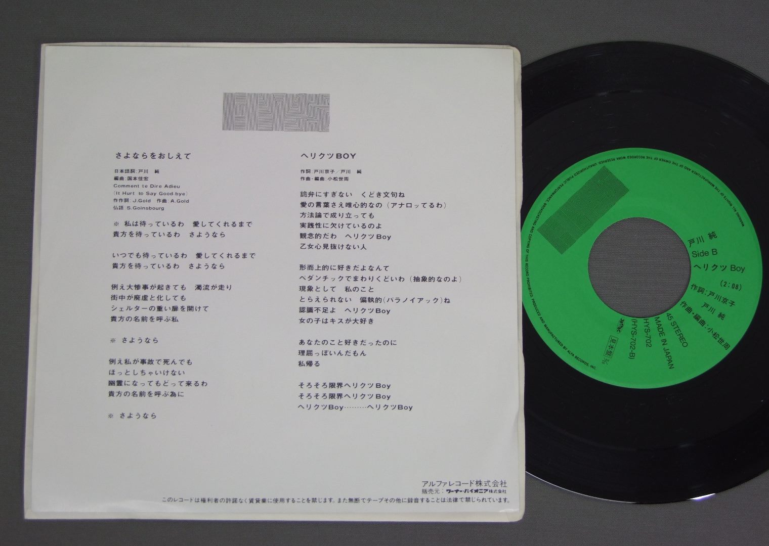 JUN TOGAWA戸川純/さよならをおしえて HYS702 製造国:日本盤 / Media:7inch外観:EX+盤の状態:EX+ 価格(税込):¥838(売約済) 送料 7inch:定形外郵便 360円~LP:定形外郵便 660円~送料は、注文の最終画面で確認頂けます。 > > JUN TOGAWA/ 外観 (EX+)特記事項:特記無し。コンディションリストを参照下さい。外観EX+の共通説明:中古としては美品、一見してきれいでダメージが軽微。シミ、ヨゴレ、スレ有っても僅か~少し。 盤の状態 (EX+)特記事項:極薄いスリキズ・スレ少しだけ。一見してきれいな状態です。盤EX+の共通説明:盤面の極薄いスリキズ、スレ少し程度 音に出そうなものは無いように見える(極軽微なソフトティック音は除く)。 その他:※画像では確認できない、上下ヘリ、背表紙、取り出し口を中心に状態表記しております。画像で確認出来る表裏ジャケ、レーベルの状態表記は省いている場合がありますので、そちらの状態は画像でご確認をお願い致します。携帯の方は一度PC等で写真をご確認の上ご入札下さいますよう、お願い申し上げます。 Tweet それぞれの画像をクリックすると、大きい写真が見られます こちらの商品もお勧めです 1,210円 YUMI MATSUTOYA松任谷由実 / DA・DI・DAダ・ディ・ダ 990円 TAKASHI SATO佐藤隆 / UN HOMME ET UNE FEMME男と女 770円 FINGER 5フィンガー5 / 1st ALBUM 880円 ALFEEアルフィー / RENAISSANCEルネッサンス 770円 YUMI MATSUTOYA松任谷由実 / DA・DI・DA 550円 MIKI ASAKURA麻倉未稀 / ROMANCEロマンス 770円 TAKURO YOSHIDA吉田拓郎 / ASUNI MUKATTE HASHIRE明日に向って走れ 880円 TAKAKO SHIRAI白井貴子 / HEART ATTACKER