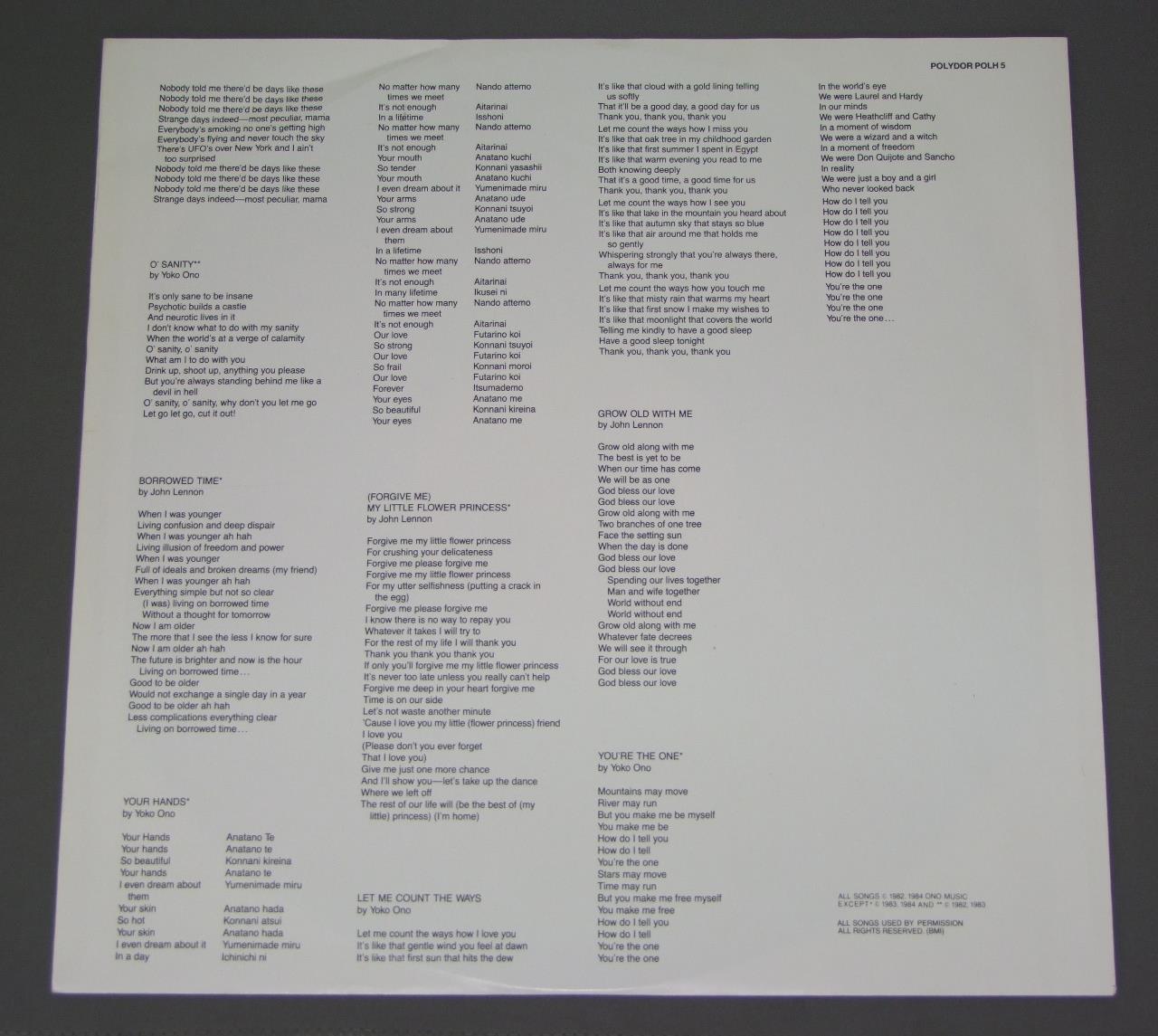 JOHN LENNON AND YOKO ONO/MILK AND HONEY POLH5 製造国:英国盤 / Media:LP外観:EX盤の状態:EX 価格(税込):¥3,300(売約済) 送料 7inch:定形外郵便 360円~LP:定形外郵便 660円~送料は、注文の最終画面で確認頂けます。 > > JOHN LENNON AND YOKO ONO/MILK AND HONEY 外観 (EX)特記事項:背下あたりに濃い目のスリキズと裂け。ジャケ表面は見開きも含めてスレやスリキズ、よごれ等は少ない感じ。オリジナルインナーもヨレやよごれ等少ない状態。外観EXの共通説明:ダメージが限定的。中古品としては保存状態がよい方。シミ、ヨゴレ、スレ 少し~軽度。 盤の状態 (EX)特記事項:薄いスリキズ・スレ少しある程度。音に出そうなものもなく一見してきれいな状態です。曲間など、静かなところを中心に聴いて見ましたが、チリノイズ少ないきれいな再生具合でした。盤EXの共通説明:盤面のスリキズが薄いものが少し~軽度 音に出そうなものは無いように見える(軽微なソフトティック音は除く)。 Tweet それぞれの画像をクリックすると、大きい写真が見られます こちらの商品もお勧めです 5,500円 GEORGE HARRISON / THIRTY THREE & 1/3 5,500円 BEATLES / AT THE HOLLYWOOD BOWL 4,950円 JOHN & YOKO - PLASTIC ONO BANDF / SOME TIME IN NEW YORK CITY 5,500円 JOHN LENNON / SHAVED FISH 5,500円 GEORGE HARRISON / LIVING IN THE MATERIAL WORLD
