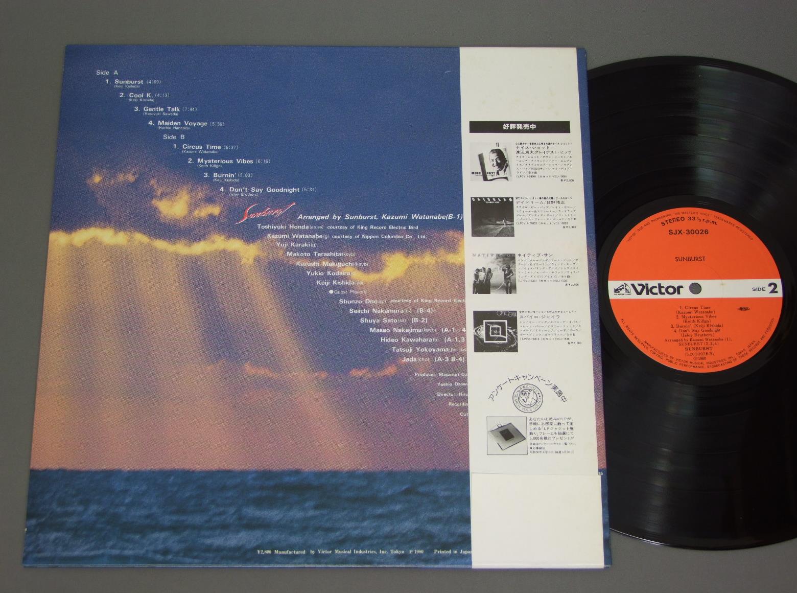 SUNBURSTサンバースト/SUNBURSTサンバースト SJX30026 製造国:日本盤 / Media:LP外観:EX+盤の状態:EX+帯:EX- 価格(税込):¥1,047(売約済) 送料 7inch:定形外郵便 360円~LP:定形外郵便 660円~送料は、注文の最終画面で確認頂けます。 > > SUNBURST/SUNBURST 外観 (EX+)特記事項:特記無し。コンディションリストを参照下さい。外観EX+の共通説明:中古としては美品、一見してきれいでダメージが軽微。シミ、ヨゴレ、スレ有っても僅か~少し。 盤の状態 (EX+)特記事項:極薄いスリキズ・スレ少しだけ。一見してきれいな状態です。盤EX+の共通説明:盤面の極薄いスリキズ、スレ少し程度 音に出そうなものは無いように見える(極軽微なソフトティック音は除く)。 帯の状態 (EX-):薄いシミ有り。 その他:本田俊之(SS.AS.FI)唐木裕史(G)寺下誠(KEYB)牧口一志(KEYB)小平幸雄(B)岸田恵士(DS) Tweet それぞれの画像をクリックすると、大きい写真が見られます こちらの商品もお勧めです 770円 ART TATUM&HIS BANDアート・テイタム楽団 / ART TATUM & HIS SWINGSTERSアート・テイタム・オール・スター・セッション 440円 GARY BURTON - SONNY ROLLINS - CLARK TERRYG.バートン - S.ロリンズ - C.テリー / 3 IN JAZZスリー・イン・ジャズ 1,320円 YOSHITAKA AKIMITSU秋満義孝 / VIVRE POUR VIVREパリのめぐり逢い 990円 DAVE GRUSINデイヴ・グルーシン / ONE OF A KINDデイヴ・グルーシン・ジェントル・サウンド 990円 JOSHUA RIFKINジョシュア・リフキン / PIANO RAGS BY SCOTT JOPLINスコット・ジョプリンの芸術 1,210円 PHIL WOODS & GENE QUILL QUINTETフィル・アンド・クイル5重奏団 / PHIL & QUILL WITH PRESTIGEフィル・アンド・クイル 1,650円 NORIO MAEDA前田憲男 / SOUND IN VICTRONSOUND IN VICTRON 1,210円 ERROLL GARNERエロール・ガーナー / SERENADE TO LAURAセレナード・トゥ・ローラ
