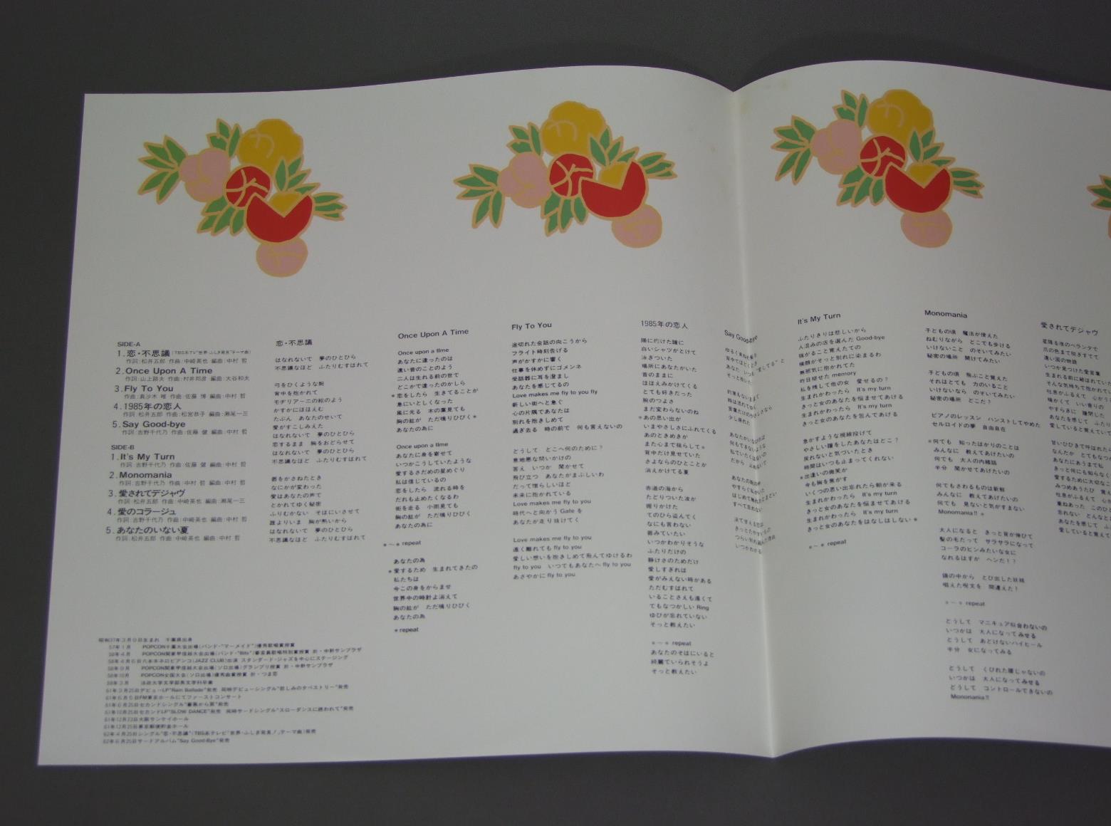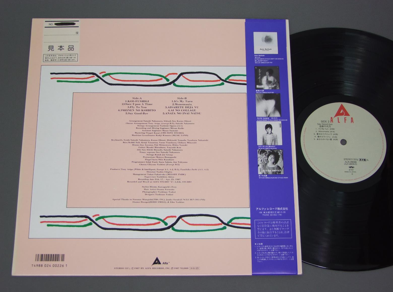 吉野千代乃/SAY GOOD-BYEセイ・グッバイ ALR28098 製造国:日本盤 / Media:LP外観:EX+盤の状態:EX+帯:EX+ 価格(税込):¥1,047(売約済) 送料 7inch:定形外郵便 360円~LP:定形外郵便 660円~送料は、注文の最終画面で確認頂けます。 > > /SAY GOOD-BYE 外観 (EX+)特記事項:特記無し。コンディションリストを参照下さい。外観EX+の共通説明:中古としては美品、一見してきれいでダメージが軽微。シミ、ヨゴレ、スレ有っても僅か~少し。 盤の状態 (EX+)特記事項:極薄いスリキズ・スレ少し。一見してきれいな状態です。盤EX+の共通説明:盤面の極薄いスリキズ、スレ少し程度 音に出そうなものは無いように見える(極軽微なソフトティック音は除く)。 帯の状態 (EX+):特記無し。コンディションリストを参照下さい。 その他:見本盤 Tweet それぞれの画像をクリックすると、大きい写真が見られます こちらの商品もお勧めです 770円 TAKURO YOSHIDA吉田拓郎 / ASUNI MUKATTE HASHIRE明日に向って走れ 1,650円 YOSHIKO SAGA嵯峨美子 / ANATANIあなたに 880円 AKIRA INABA因幡晃 / NANIKA IIWASURETA YOUNA何か言い忘れたようで… 880円 NUMBER ONE BANDナンバーワン・バンド / TOKYO ATARI東京あたり 770円 EMU絵夢 / EMU 2絵夢 II 770円 KUMIKO YAMASHITA山下久美子 / DANCIN`IN THE KITCHEN 770円 HIROMI IWASAKI岩崎宏美 / AOZORAあおぞら 770円 MAYUMI ITSUWA五輪真弓 / MICHI岐路(みち)