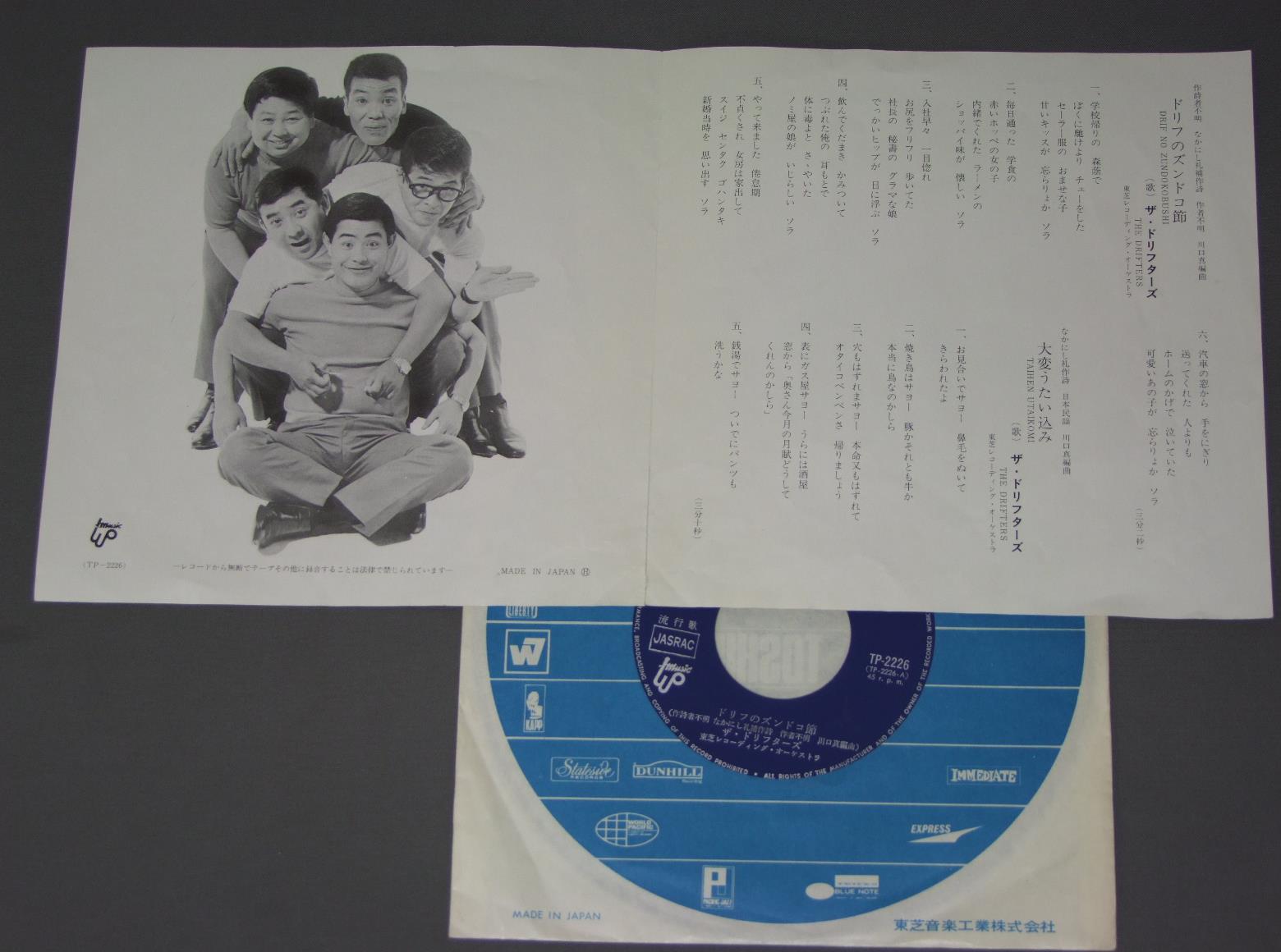 ドリフターズ/ドリフのズンドコ節 TP2226 製造国:日本盤 / Media:7inch外観:EX-盤の状態:EX+ 価格(税込):¥660(売約済) 送料 7inch:定形外郵便 360円~LP:定形外郵便 660円~送料は、注文の最終画面で確認頂けます。 > > / 外観 (EX-)特記事項:背下で割れ。ヨレ多少有り。外観EX-の共通説明:ダメージ軽度~多少。 中古品としては普通の状態。シミ、ヨゴレ、スレなど軽く~多少。 盤の状態 (EX+)特記事項:薄いスリキズ・スレ少し。一見してきれいな状態です。盤EX+の共通説明:盤面の極薄いスリキズ、スレ少し程度 音に出そうなものは無いように見える(極軽微なソフトティック音は除く)。 その他:※画像では確認できない、上下ヘリ、背表紙、取り出し口を中心に状態表記しております。画像で確認出来る表裏ジャケ、レーベルの状態表記は省いている場合がありますので、そちらの状態は画像でご確認をお願い致します。携帯の方は一度PC等で写真をご確認の上ご入札下さいますよう、お願い申し上げます。 Tweet それぞれの画像をクリックすると、大きい写真が見られます こちらの商品もお勧めです 990円 RYOKO MORIYAMA森山良子 / RYOKO NOW旅立ち-森山良子-1972 770円 HIROMI IWASAKI岩崎宏美 / HIKOUSEN飛行船 770円 EIKICHI YAZAWA矢沢永吉 / P M 9 990円 YOUSUI INOUE井上陽水 / LIVE陽水ライヴ-もどり道 440円 AYUMI NAKAMURA中村あゆみ / FAIR CHILD 770円 GO OHGAMI大神剛 / SLEEPING THE TOWN 880円 YUMI MATSUTOYA松任谷由実 / RE INCARNATIONリ・インカーネイション 880円 ALFEEアルフィー / RENAISSANCEルネッサンス