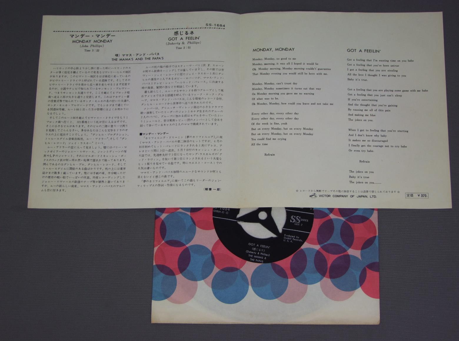 THE MAMAS &THE PAPASママス・アンド・パパス/MONDAY MONDAYマンデー・マンデー SS1684 製造国:日本盤 / Media:7inch外観:EX盤の状態:EX+ 価格(税込):¥770(売約済) 送料 7inch:定形外郵便 360円~LP:定形外郵便 660円~送料は、注文の最終画面で確認頂けます。 > > THE MAMAS &THE PAPAS/MONDAY MONDAY 外観 (EX)特記事項:多少薄い日焼け有り。外観EXの共通説明:ダメージが限定的。中古品としては保存状態がよい方。シミ、ヨゴレ、スレ 少し~軽度。 盤の状態 (EX+)特記事項:薄いスリキズ・スレ少し。一見してきれいな状態です。盤EX+の共通説明:盤面の極薄いスリキズ、スレ少し程度 音に出そうなものは無いように見える(極軽微なソフトティック音は除く)。 その他:※画像では確認できない、上下ヘリ、背表紙、取り出し口を中心に状態表記しております。画像で確認出来る表裏ジャケ、レーベルの状態表記は省いている場合がありますので、そちらの状態は画像でご確認をお願い致します。携帯の方は一度PC等で写真をご確認の上ご入札下さいますよう、お願い申し上げます。 Tweet それぞれの画像をクリックすると、大きい写真が見られます こちらの商品もお勧めです 1,320円 KENNY ROGERS AND THE FIRST EDITIONケニー・ロジャースとファースト・エディション / TRANSITIONトランジション 1,650円 FOREINERフォリナー / DOUBLE VISONダブル・ビジョン 1,210円 STYX酢亭久洲 / REPPOO烈風 770円 SANTANAサンタナ / INNER SECRETS太陽の秘宝 770円 STYXスティクス / CORNERSTONEコーナーストーン 990円 BYREDSバーズ / BYRDSバーズ 990円 STYXスティクス / PARADISE THEATERパラダイス・シアター 1,210円 MOUNTAINマウンテン / FLOWERS OF EVILマウンテン・ライヴ 悪の華(フィルモアに咲いた悪の華)