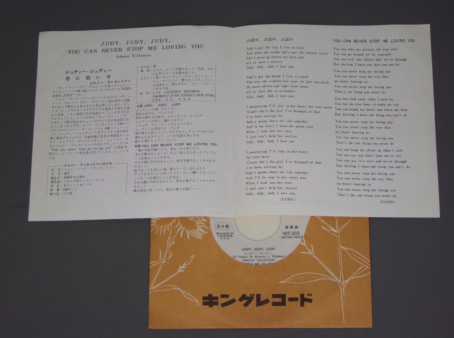 JOHNNY TILLOTSONジョニー・ティロットソン/JUDY JUDY JUDYジュディー・ジュディー HIT203 製造国:日本盤 / Media:7inch外観:EX+盤の状態:EX 価格(税込):¥2,575(売約済) 送料 7inch:定形外郵便 360円~LP:定形外郵便 660円~送料は、注文の最終画面で確認頂けます。 > > JOHNNY TILLOTSON/JUDY JUDY JUDY 外観 (EX+)特記事項:特記無し。コンディションリストを参照下さい。外観EX+の共通説明:中古としては美品、一見してきれいでダメージが軽微。シミ、ヨゴレ、スレ有っても僅か~少し。 盤の状態 (EX)特記事項:薄いスリキズ・スレ少しある感じ。一見してきれいな印象です。盤EXの共通説明:盤面のスリキズが薄いものが少し~軽度 音に出そうなものは無いように見える(軽微なソフトティック音は除く)。 Tweet それぞれの画像をクリックすると、大きい写真が見られます こちらの商品もお勧めです 1,320円 ELVIS PRESLEY / THAT`S THE WAY IT ISこの胸のときめきを 2,420円 CLIFF RICHARDクリフ・リチャード / CLIFF IN JAPAN 770円 VARIOUS ARTISTS / YESTERDAY`S HITSイエスタデイズ・ヒッツ 990円 RICK NELSONリック・ネルソン / ALBUM SEVEN BY RICKアルバム・セブン・バイ・リック 770円 RICK NELSONリック・ネルソン / ALBUM SEVEN BY RICKアルバム・セブン・リック 990円 ELVISエルヴィス / THIS IS ELVIS-SELECTIONS FROM THE ORIGINAL MOTION PICUTRE SOUNDTRACK映画 THIS IS ELVIS オリジナル・サウンドトラック 770円 ELVIS PRESLEYエルヴィス・プレスリー / ELVIS-THAT`S THE WAY IT ISこの胸のときめきを -MGM映画 エルヴィス・オン・ステージ 主題歌集 1,210円 ELVIS PRESLEYエルヴィス・プレスリー / THAT`S THE WAY IT ISこの胸のときめきを