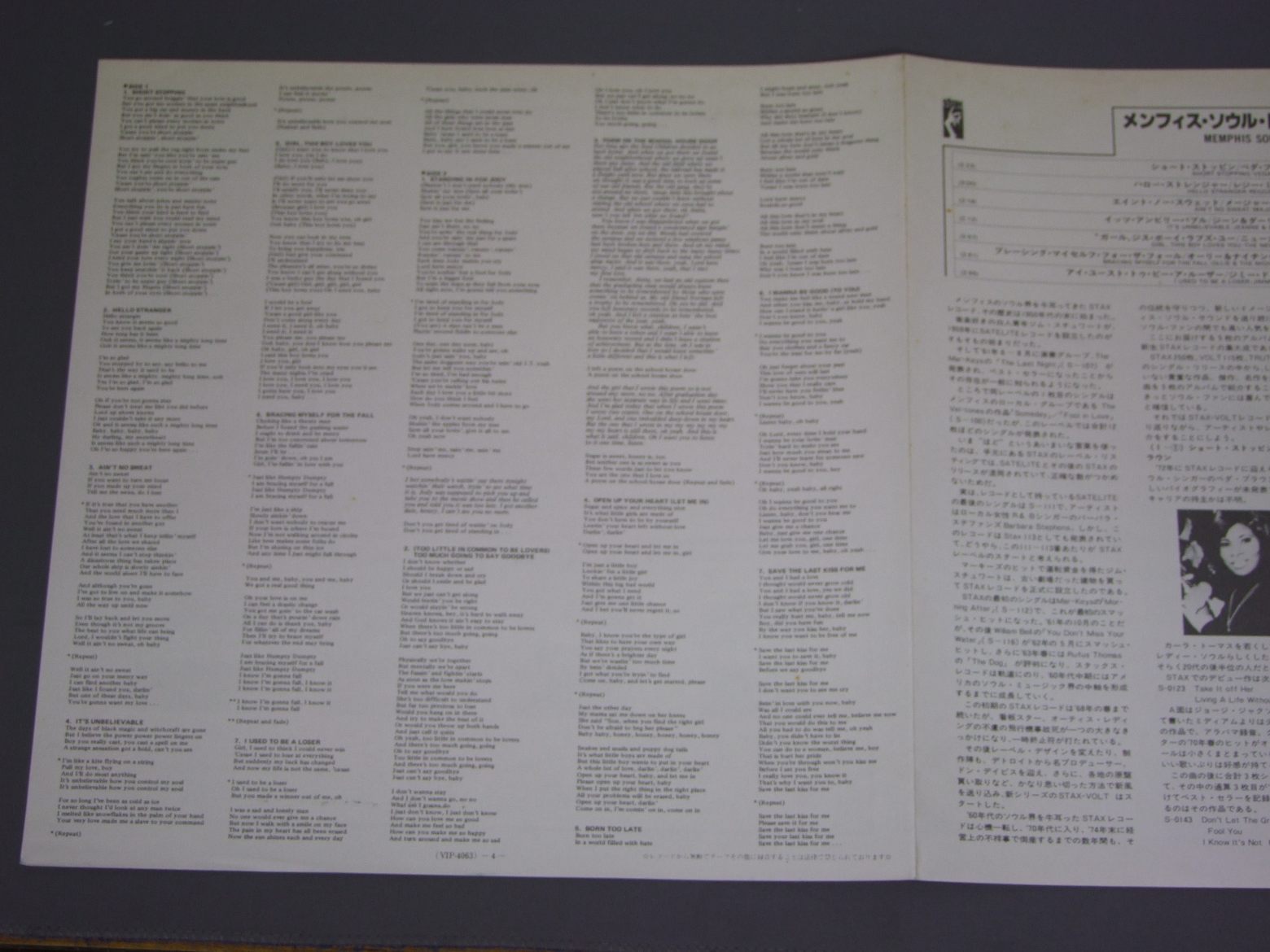 VARIOUS MEMPHIS SOUL GROUP/MEMPHIS SOUL RARE COLLECTION VOL. 1 VIP-4063 製造国:日本盤 / Media:LP外観:VG+盤の状態:EX 価格(税込):¥660(売約済) 送料 7inch:定形外郵便 360円~LP:定形外郵便 660円~送料は、注文の最終画面で確認頂けます。 > > VARIOUS MEMPHIS SOUL GROUP/MEMPHIS SOUL RARE COLLECTION VOL. 1 外観 (VG+)特記事項:角スレや上ヘリでスレ大。底抜け有り。裏ジャケの上ヘリに日焼けシミ軽多少有り。外観VG+の共通説明:ダメージやや有り。シミ、ヨゴレ、スレなど多少~やや多め。 盤の状態 (EX)特記事項:薄いスリキズ・スレ軽くある感じ。長めの薄いスレなどもありますが、軽微なものの様子です。盤EXの共通説明:盤面のスリキズが薄いものが少し~軽度 音に出そうなものは無いように見える(軽微なソフトティック音は除く)。 その他:※画像では確認できない、上下ヘリ、背表紙、取り出し口を中心に状態表記しております。画像で確認出来る表裏ジャケ、レーベルの状態表記は省いている場合がありますので、そちらの状態は画像でご確認をお願い致します。携帯の方は一度PC等で写真をご確認の上ご入札下さいますよう、お願い申し上げます。 Tweet それぞれの画像をクリックすると、大きい写真が見られます こちらの商品もお勧めです 880円 GLADYS KNIGHT & THE PIPSグラディス・ナイト&ザ・ピップス / I FEEL A SONGアイ・フィール・ア・ソング 770円 WRITERS / WRITERSニュー・リズム・マシーン登場 770円 THREE DEGREES & MFSBスリー・ディグリーズ &MFSB / THREE DEGREES & MFSB SHOWスリー・ディグリーズ &MFSBショー 660円 WHISPERSウィスパーズ / SO GOODソー・グッド 1,210円 DAZZ BANDダズ・バンド / KEEP IT LIVEキープ・イット・ライブ 1,210円 DRAMATICSドラマティックス / SOMEWHERE IN TIMEドラマティック・リユニオン 1,210円 TAVARESタバレス / WORDS AND MUSICワーズ&ミュージック 1,320円 DIANA ROSSダイアナ・ロス / ROSSロス