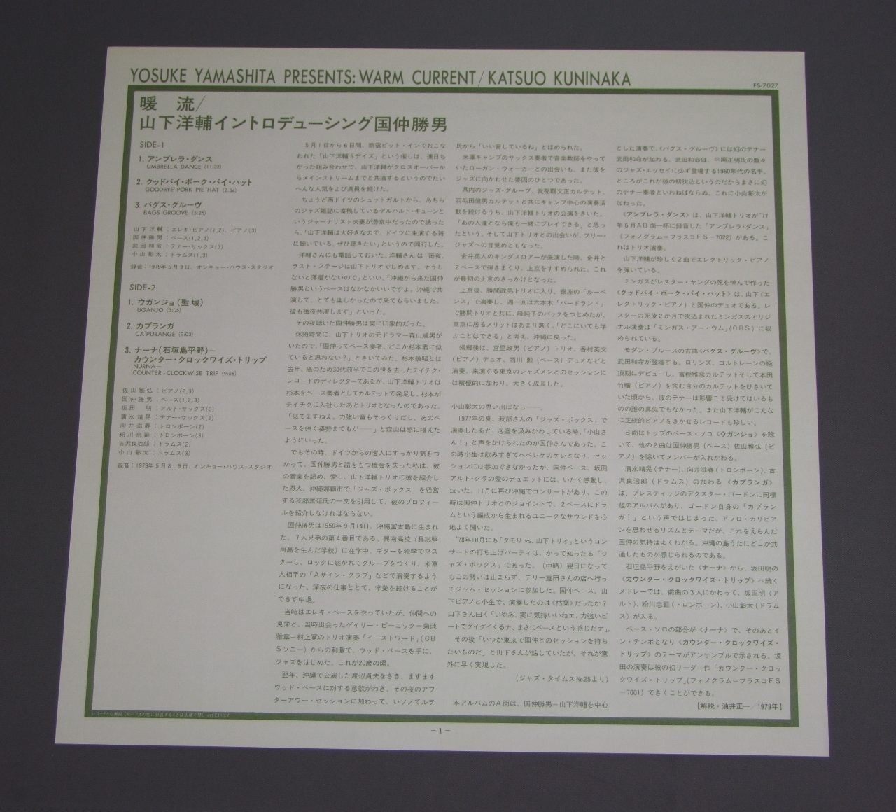 山下洋輔+国仲勝男/WARM CURRENT暖流 FS-7027 製造国:日本盤 / Media:LP外観:EX+盤の状態:EX+帯:EX+ 価格(税込):¥1,047(売約済) 送料 7inch:定形外郵便 360円~LP:定形外郵便 660円~送料は、注文の最終画面で確認頂けます。 > > /WARM CURRENT 外観 (EX+)特記事項:特記無し。コンディションリストを参照下さい。外観EX+の共通説明:中古としては美品、一見してきれいでダメージが軽微。シミ、ヨゴレ、スレ有っても僅か~少し。 盤の状態 (EX+)特記事項:極薄いスリキズ・スレ少しだけ。一見してきれいな状態です。盤EX+の共通説明:盤面の極薄いスリキズ、スレ少し程度 音に出そうなものは無いように見える(極軽微なソフトティック音は除く)。 帯の状態 (EX+):特記無し。コンディションリストを参照下さい。 Tweet それぞれの画像をクリックすると、大きい写真が見られます こちらの商品もお勧めです 1,650円 MASABUMI KIKUCHI + GIL EVANS菊池雅章 / SAME TITLEWITH ギル・エヴァンス 770円 JACQUES LOUSSIER TRIOジャック・ルーシェ・トリオ / PLAY BACH VOL4プレイ・バッハ第4集 1,320円 TERUMASA HINO SEXTET日野皓正セクステット / FUJI藤 1,210円 BUCK CLAYTONバック・クレイトン / PASSORT TO PARADISEスポート・トゥ・パラダイス 990円 TAKEHIKO HONDA本田竹彦 / JODO浄土 990円 EUGEN CICEROオイゲン・キケロ / BALKAN RHAPSODYバルカン・ラプソディー 1,320円 YOSHITAKA AKIMITSU秋満義孝 / VIVRE POUR VIVREパリのめぐり逢い 1,320円 CHARLIE MINGUSチャーリー・ミンガス / PITHECANTHROPUS ERECTUS直立猿人