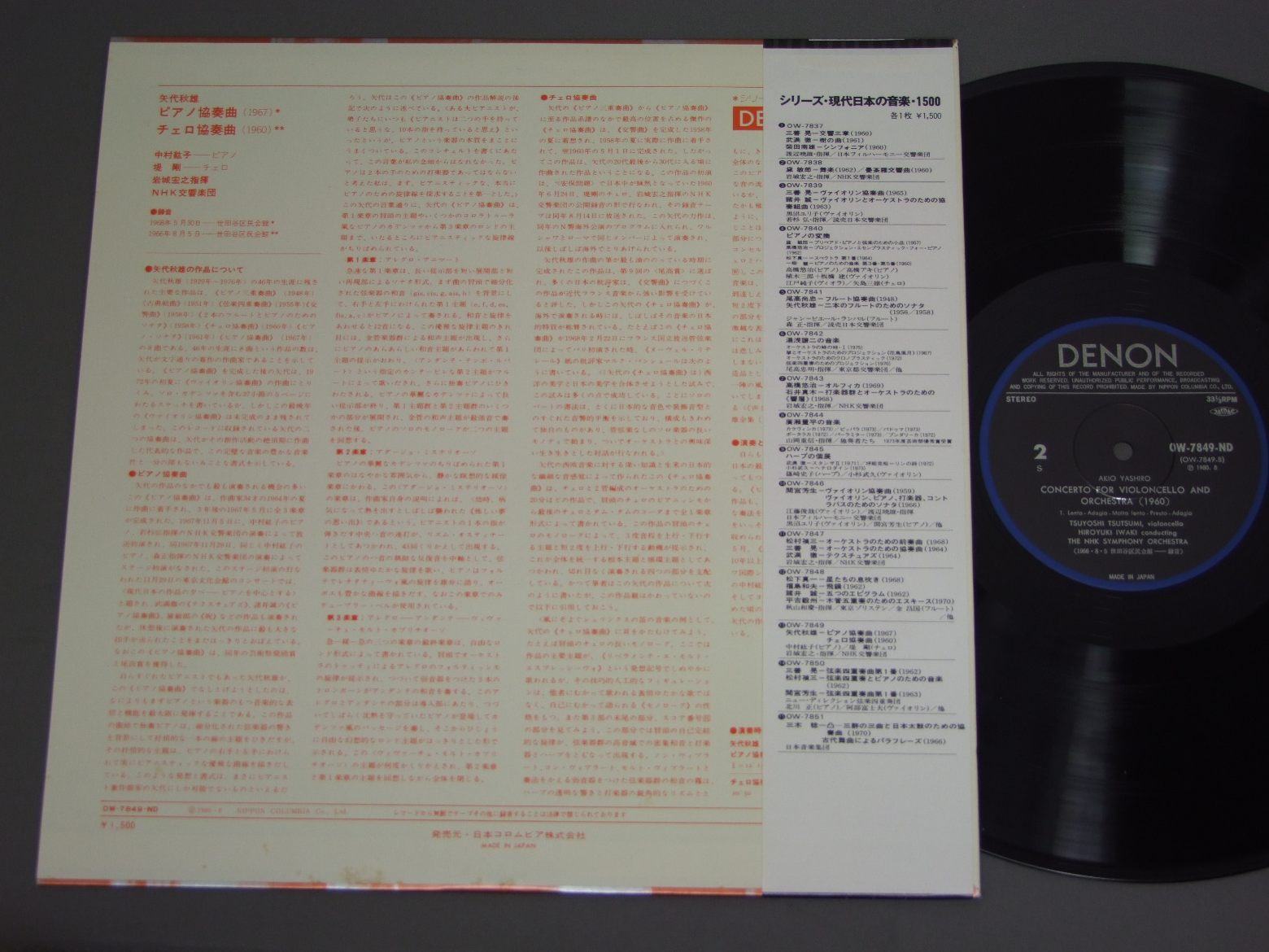 AKIO YASHIRO矢代秋雄/PIANO & CELLO CONCERTO ピアノ協奏曲/チェロ協奏曲 OW-7849-ND 製造国:日本盤 / Media:LP外観:EX+盤の状態:EX+帯:EX+ 価格(税込):¥2,640(売約済) 送料 7inch:定形外郵便 360円~LP:定形外郵便 660円~送料は、注文の最終画面で確認頂けます。 > > AKIO YASHIRO/PIANO & CELLO CONCERTO 外観 (EX+)特記事項:特記無し。コンディションリストを参照下さい。外観EX+の共通説明:中古としては美品、一見してきれいでダメージが軽微。シミ、ヨゴレ、スレ有っても僅か~少し。 盤の状態 (EX+)特記事項:極薄いスリキズ・スレ少し。一見してきれいな状態です。盤EX+の共通説明:盤面の極薄いスリキズ、スレ少し程度 音に出そうなものは無いように見える(極軽微なソフトティック音は除く)。 帯の状態 (EX+):特記無し。コンディションリストを参照下さい。 Tweet それぞれの画像をクリックすると、大きい写真が見られます こちらの商品もお勧めです 1,430円 YASUSHI AKUTAGAWA芥川也寸志 / FUMIO HAYASAKA - RASHOMON FROM FILM MUSIC etc早坂文雄管弦楽選集 映画音楽羅生門から 1,650円 HIROYUKI IWAKI - NHK SYM. ORCH.岩城宏之 - NHK交響楽団 / ORIGINAL WORKS BY CONTEMPORARY JAPANESE COMPOSERS現代日本の音楽 1,540円 ENSEMBLE INSTRUMENTAL DE TOULOUSEトゥールーズ管楽器合奏団 / ENSEMBLE INSTRUMENTAL DE TOULOUSE現代管楽器名曲集 990円 NOBUAKI TANAKA田中信昭 / SHOUSAKU YUYAMA WORKS湯山昭作品集 990円 MANFRED REICHERTマンフレート・ライヒェルト / HINDEMITH - DIE 2 KAMMERMUSIKENヒンデミット - 室内音楽第5番 第7番 990円 FERNANDEZ - DEPLUS - NEILZフェルナンデ - ドゥプリュス - ネル - プティ / MESSIAN - QUATUOR POUR LA FIN DU TEMPSメシアン - 世の終わりのための四重奏曲 990円 MANFRED REICHERTマンフレート・ライヒェルト / HINDEMITH - DIE 2 KAMMERMUSIKENヒンデミット - 室内音楽第3番 第4番 1,980円 RAMPAL - JOLIVET - CONCERTS LAMOUREUXランパル - ジョリヴェ - ラムルー管弦楽団 / JOLIVET - DEUX CONC. POUR FLUTE etcジョリヴェ - フルートと弦楽オーケストラのための協奏曲他