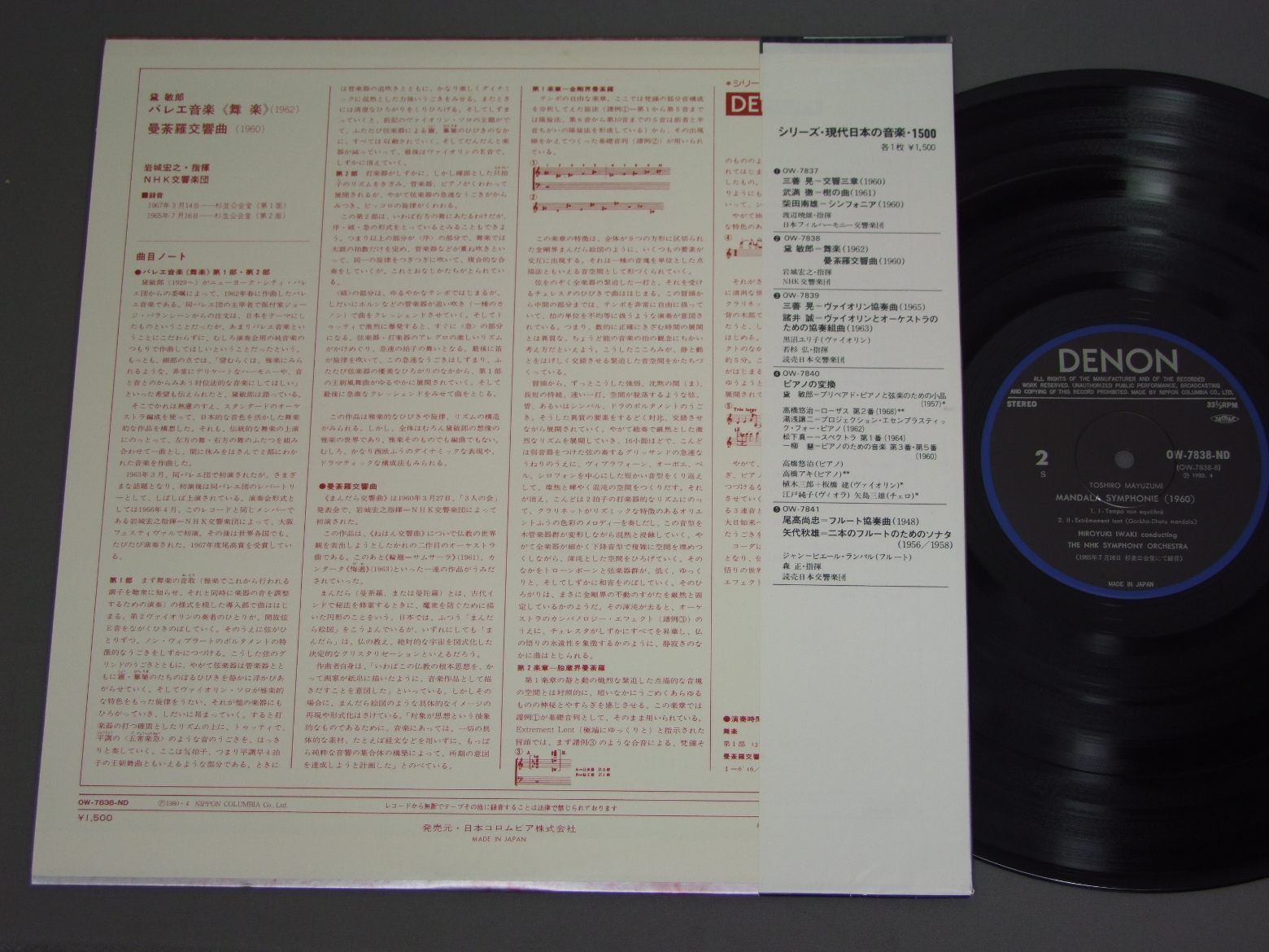 黛敏郎/BUGAKU MANDALA SYMPHONIE 舞楽/曼荼羅交響曲 OW-7838-ND 製造国:日本盤 / Media:LP外観:EX+盤の状態:EX+帯:EX+ 価格(税込):¥1,650(売約済) 送料 7inch:定形外郵便 360円~LP:定形外郵便 660円~送料は、注文の最終画面で確認頂けます。 > > /BUGAKU MANDALA SYMPHONIE 外観 (EX+)特記事項:特記無し。コンディションリストを参照下さい。外観EX+の共通説明:中古としては美品、一見してきれいでダメージが軽微。シミ、ヨゴレ、スレ有っても僅か~少し。 盤の状態 (EX+)特記事項:極薄いスリキズ・スレ少し。一見してきれいな状態です。盤EX+の共通説明:盤面の極薄いスリキズ、スレ少し程度 音に出そうなものは無いように見える(極軽微なソフトティック音は除く)。 帯の状態 (EX+):特記無し。コンディションリストを参照下さい。 Tweet それぞれの画像をクリックすると、大きい写真が見られます こちらの商品もお勧めです 990円 TOSHIO KORA神良聡夫 / TOSHIO KORA 3 PIECES FOR STRING QUARTET神良聡夫:弦楽四重奏のための三つの小品 1,540円 ENSEMBLE 15 BADEN-BADEN-REICHERTバーデン・バーデン合奏団-ライヒェルト / HINDEMITH-DIE 2 KAMMERMUSIKENヒンデミット-室内音楽III 1,430円 BOULEZブーレーズ / MESSIAEN/ET EXSPECTO RESURRECTIONEM MORTUORUM-COULEURS DE LA CITE CELESTEメシアン/われ. 死者の復活を待ち受ける 天国の色彩 1,430円 AULOS QUINTET etcアウロス五重奏団 他 / MICHIO MAMIYA/QUATUOR A CORDES NO1 etc間宮芳生/第1番 他 1,760円 MITUO KOBAYASHI小林光雄/石橋義也 / RYOUHEI HIROSE WORKS広瀬量平作品集/混声合唱組曲海の詩/海鳥の詩 990円 KAZUYOSHI AKIYAMA秋山和慶 / MAKOTO MOROI - PIANO CONCERTO NO1 etc諸井誠 - ピアノ協奏曲第1番 他 2,200円 GALINA VISHNEVSKAYAガリーナ・ヴィシュネフスカヤ-ピーター・ピアーズ-ベンジャミン・ブリテン 他 / BRITTEN-WAR REQUIEMブリテン-戦争レクイエム 1,980円 AKEO WATANABE -HIROSHI WAKASUGI渡辺暁雄 - 若杉弘 / MITIO MAMIYA - AKIO YASIRO - AKIRA MIYOSHI現代日本の三大協奏曲 - 間宮 矢代 三善