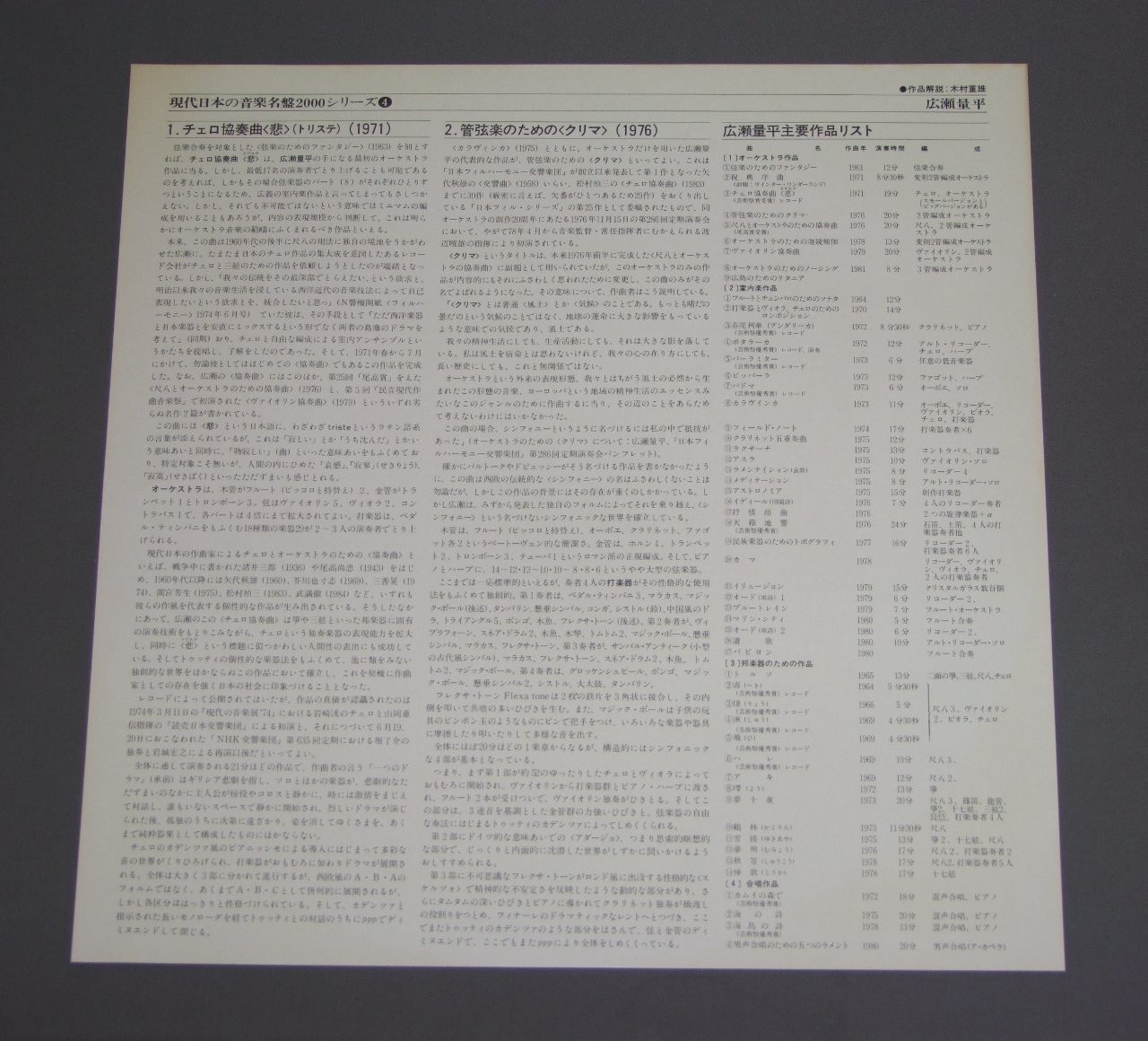 広瀬量平/CHELLO CONCERT TRISTE チェロ協奏曲〈悲(トリステ)〉 SJX-1173 製造国:日本盤 / Media:LP外観:EX+盤の状態:EX+帯:EX+ 価格(税込):¥2,090(売約済) 送料 7inch:定形外郵便 360円~LP:定形外郵便 660円~送料は、注文の最終画面で確認頂けます。 > > /CHELLO CONCERT TRISTE 外観 (EX+)特記事項:特記無し。コンディションリストを参照下さい。外観EX+の共通説明:中古としては美品、一見してきれいでダメージが軽微。シミ、ヨゴレ、スレ有っても僅か~少し。 盤の状態 (EX+)特記事項:極薄いスリキズ・スレ少し。一見してきれいな状態です。盤EX+の共通説明:盤面の極薄いスリキズ、スレ少し程度 音に出そうなものは無いように見える(極軽微なソフトティック音は除く)。 帯の状態 (EX+):特記無し。コンディションリストを参照下さい。 Tweet それぞれの画像をクリックすると、大きい写真が見られます こちらの商品もお勧めです 880円 AKIRA MIYOSI三善晃 / LYRICISM OF THREE三つの抒情 990円 R.SASAKI MANDOLIN ORCH.佐伯亮とマンドリン・オーケストラ / JAPANESE MELODYマンドリンの調べ/抒情歌謡 2,090円 DESIRE DONDEYNEデジレ・ドンディーヌ / FAURE-CHANT FUNERAIREフレンチ・ブラスの精粋 990円 BERNSTEIN etc.中村絋子と大町陽一郎 / NEW BEST CLASSICS 150楽しい音楽談義による名曲ガイダンス 1,760円 YASUHIKO SHIOZAWA - TOKYO ACADEMIC WIND ORCH.汐澤安彦 - 東京アカデミック・ウインド・オーケストラ / BEST SELECTIONS FOR BAND `86 VOL2吹奏楽ベストセレクション `86 VOL2 1,540円 山本恵美 - 上柳喜久代 - 福森通子 他 / 昭和47年度第42回新人演奏会 その3 990円 SLATKINスラットキン / MILITARY BANDミリタリー・バンド 1,760円 JAPANESE HARP山内喜美子と清流会 / POPS BEST COLLECTION琴の旅 魅惑のポピュラー名曲集