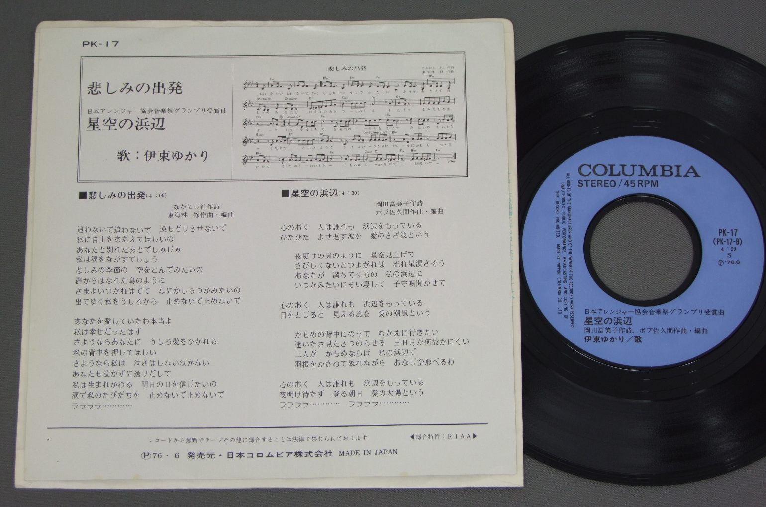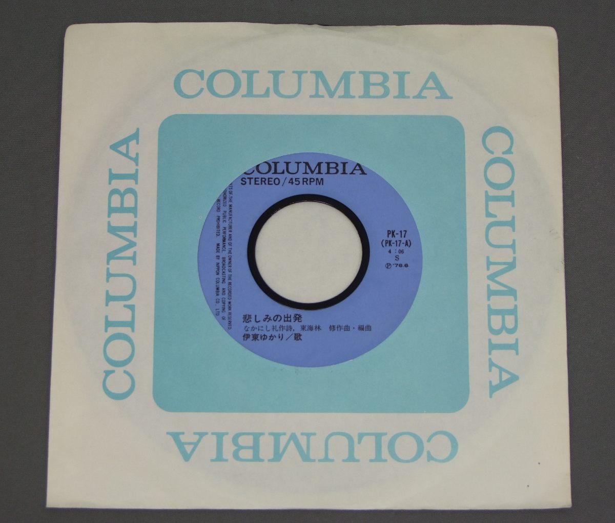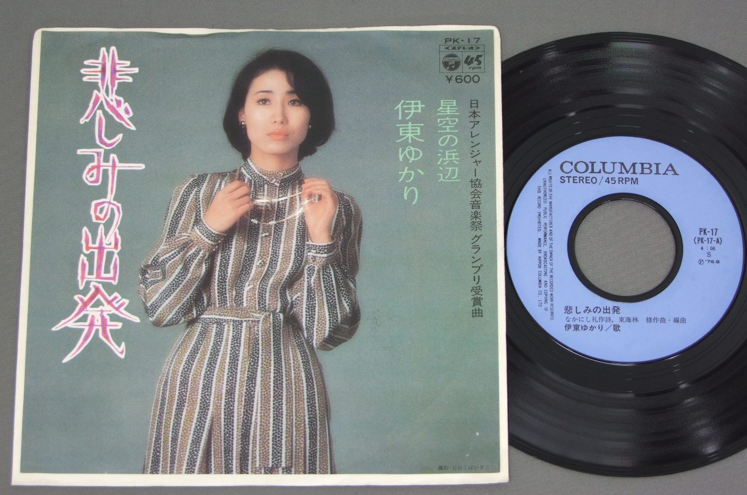 伊東ゆかり/悲しみの出発 PK-17 製造国:日本盤 / Media:7inch外観:EX盤の状態:EX 価格(税込):¥524(売約済) 送料 7inch:定形外郵便 360円~LP:定形外郵便 660円~送料は、注文の最終画面で確認頂けます。 > > / 外観 (EX)特記事項:右下にホッチキス穴。外観EXの共通説明:ダメージが限定的。中古品としては保存状態がよい方。シミ、ヨゴレ、スレ 少し~軽度。 盤の状態 (EX)特記事項:薄いスリキズ・スレ少しある程度。一見してきれいな状態です。盤EXの共通説明:盤面のスリキズが薄いものが少し~軽度 音に出そうなものは無いように見える(軽微なソフトティック音は除く)。 その他:※画像では確認できない、上下ヘリ、背表紙、取り出し口を中心に状態表記しております。画像で確認出来る表裏ジャケ、レーベルの状態表記は省いている場合がありますので、そちらの状態は画像でご確認をお願い致します。携帯の方は一度PC等で写真をご確認の上ご入札下さいますよう、お願い申し上げます。 Tweet それぞれの画像をクリックすると、大きい写真が見られます こちらの商品もお勧めです 770円 SHOGO HAMADA浜田省吾 / CLUB SNOWBOUND 1,320円 TAMAKI SAWA沢たまき / DON`T SMOKE IN BEDベッドで煙草を吸わないで 770円 HAJIME TACHIBANA立花はじめ / MR. TECHIE & MISS KIPPLE 880円 YUKARI ITOH伊東ゆかり 布施 明 / DELUXE伊東ゆかりと布施 明-ふたりの愛の世界- 990円 TAKASHI SATO佐藤隆 / UN HOMME ET UNE FEMME男と女 770円 YUZO KAYAMA加山雄三 / ALL ABOUT YUZO KAYAMA VOL2加山雄三の全て第2集 1,210円 SNAKEMAN SHOWスネークマン・ショー / 急いで口で吸え! 770円 MOONRIDERSムーンライダーズ / SUMMER ORGASM夏の日のオーガズム