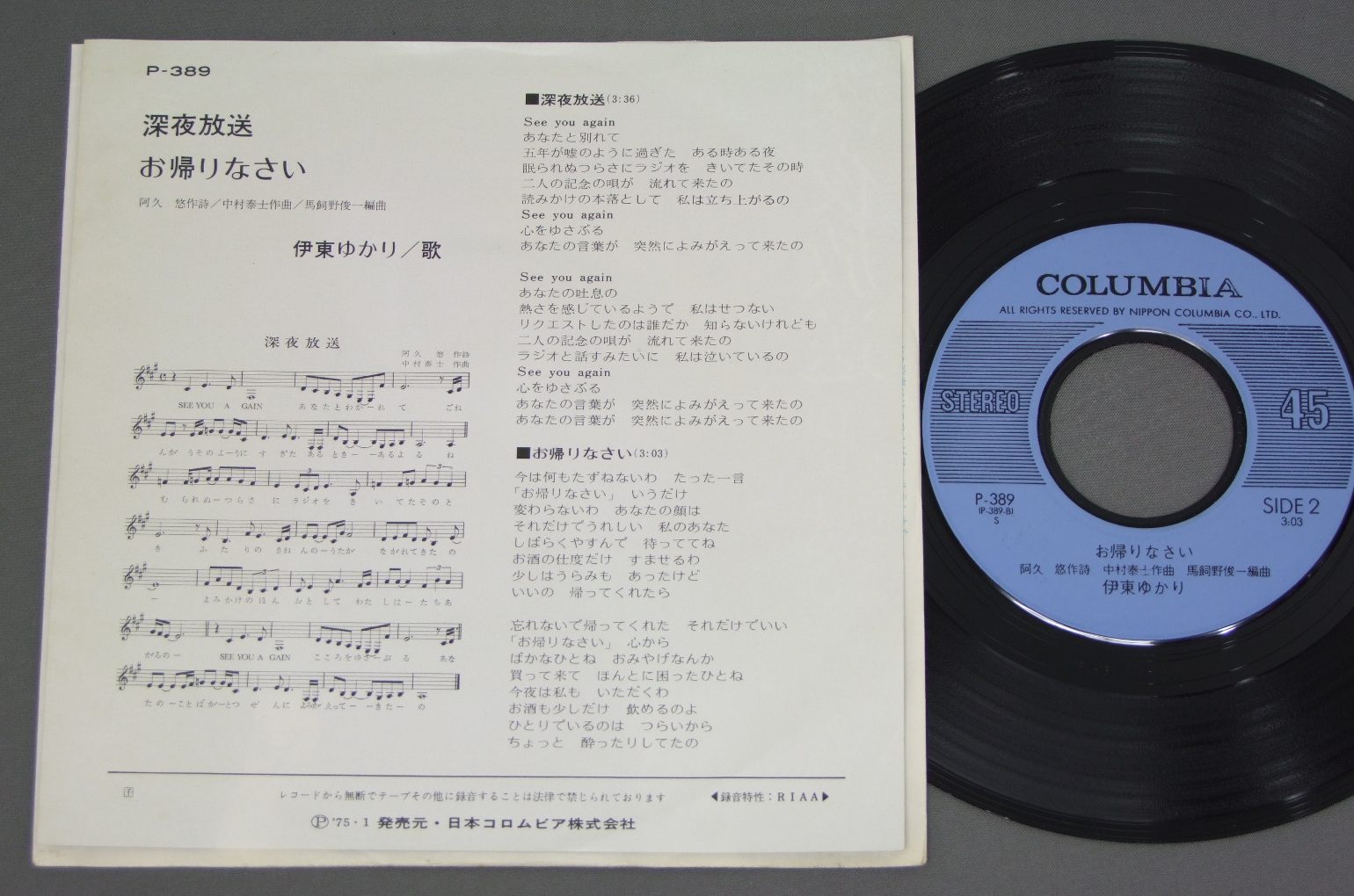 伊東ゆかり/深夜放送 P-389 製造国:日本盤 / Media:7inch外観:EX盤の状態:EX+ 価格(税込):¥524(売約済) 送料 7inch:定形外郵便 360円~LP:定形外郵便 660円~送料は、注文の最終画面で確認頂けます。 > > / 外観 (EX)特記事項:特記無し。コンディションリストを参照下さい。外観EXの共通説明:ダメージが限定的。中古品としては保存状態がよい方。シミ、ヨゴレ、スレ 少し~軽度。 盤の状態 (EX+)特記事項:薄いスリキズ・スレ少し。一見してきれいな状態です。盤EX+の共通説明:盤面の極薄いスリキズ、スレ少し程度 音に出そうなものは無いように見える(極軽微なソフトティック音は除く)。 その他:※画像では確認できない、上下ヘリ、背表紙、取り出し口を中心に状態表記しております。画像で確認出来る表裏ジャケ、レーベルの状態表記は省いている場合がありますので、そちらの状態は画像でご確認をお願い致します。携帯の方は一度PC等で写真をご確認の上ご入札下さいますよう、お願い申し上げます。 Tweet それぞれの画像をクリックすると、大きい写真が見られます こちらの商品もお勧めです 1,210円 ALFIEアルフィー / GREENHORN ( VICTOR YEARS 1974-76 ) + OUTER COVERGREENHORN ( VICTOR YEARS 1974-76 ) + オリジナル外袋 770円 GO OHGAMI大神剛 / SLEEPING THE TOWN 1,210円 MIYUKI NAKAJIMA中島みゆき / OKAERINASAIおかえりなさい 1,210円 ALL NIGHTERSオールナイターズ / 2nd ALBUMKIRAっとジェネレーション 770円 EIGO KAWASHIMA河島英五 / SHINBOU信望 770円 KEIKO MARUYAMA丸山圭子 / HARUSHIGURE春しぐれ 770円 KONOMI SASAKI佐々木好(このみ) / KOKORO NO UCHI GA WAAREBA YOI心のうちがわかればいいのに 2,200円 ALFEEアルフィー / MASTAER SOUND PRESSINGザ・ルネッサンス MASTER SOUND盤