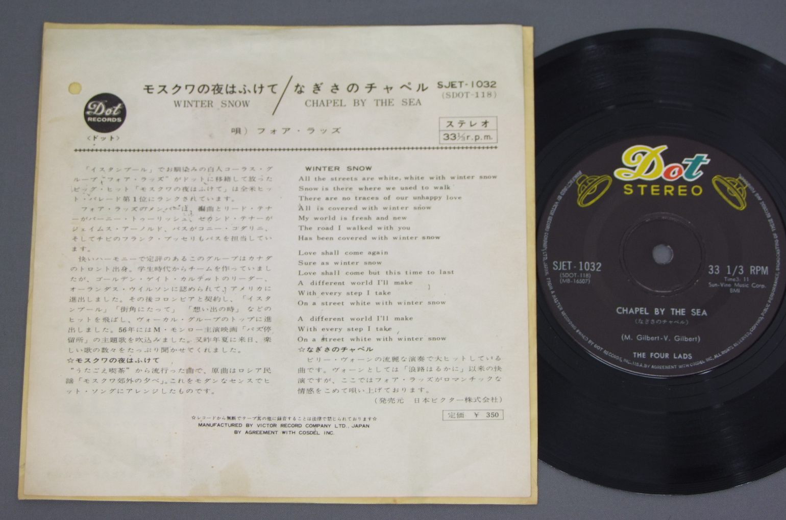 FOUR LADSフォア・ラッズ/WINTER SNOWモスクワの夜はふけて SJET-1032 製造国:日本盤 / Media:7inch外観:EX-盤の状態:EX- 価格(税込):¥440(売約済) 送料 7inch:定形外郵便 360円~LP:定形外郵便 660円~送料は、注文の最終画面で確認頂けます。 > > FOUR LADS/WINTER SNOW 外観 (EX-)特記事項:右上角付近にパンチ穴。裏側にシミが少し。外観EX-の共通説明:ダメージ軽度~多少。 中古品としては普通の状態。シミ、ヨゴレ、スレなど軽く~多少。 盤の状態 (EX-)特記事項:薄いスリキズ・細かい表面スレ多少ある感じ。殆どが軽微なものの様子です。盤EX-の共通説明:盤面のスリキズが多少有り。音に出そうなものは殆ど無いように見える~さほど気にならないぐらいの軽いプチ数カ所程度。 Tweet それぞれの画像をクリックすると、大きい写真が見られます こちらの商品もお勧めです 770円 MAHALIA JACKSONマヘリア・ジャクソン / MAHALIA JACKSON IN CONCERTマヘリア・ジャクソン・イン・コンサート 1,210円 SINGERS UNLIMITEDシンガーズ・アンリミテッド / A CAPELLA 3ア・カペラ? 1,650円 NAMI HIDAKA日高なみ / NAMI HIDAKA AUTOGRAPHED日高なみ サイン付 1,650円 SHORTY ROGERSショーティ・ロジャース・アンド・ヒズ・ジャイアンツ / BIG SHORTY ROGERS EXPRESSビッグ・ショーティ・エクスプレス 770円 BRENDA LEEブレンダ・リー / NEW EXCELLENTニュー・エクセレント 1,210円 TONY BENNETTトニー・ベネット / ART OF EXCELLENCEアート・オブ・エクセレンス 660円 PAUL ROBESONポール・ロブソン / ROBESON IN HOLY NIGHTロブソン・イン・ホーリーナイト 990円 CLEO LAINEクレオ・レーン / RETURN TO CARNEGIEリターン・トゥ・カーネギー