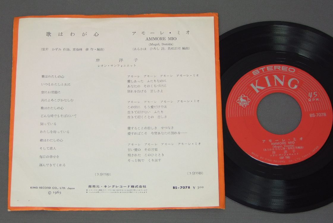 岸 洋子/AMMORE MIO歌はわが心/アモーレ・ミオ BS-7078 製造国:日本盤 / Media:7inch外観:EX盤の状態:EX 価格(税込):¥838(売約済) 送料 7inch:定形外郵便 360円~LP:定形外郵便 660円~送料は、注文の最終画面で確認頂けます。 > > /AMMORE MIO 外観 (EX)特記事項:右下にホッチキス穴。外観EXの共通説明:ダメージが限定的。中古品としては保存状態がよい方。シミ、ヨゴレ、スレ 少し~軽度。 盤の状態 (EX)特記事項:薄いスリキズ・スレ軽くある感じ。軽微なものの様子です。盤EXの共通説明:盤面のスリキズが薄いものが少し~軽度 音に出そうなものは無いように見える(軽微なソフトティック音は除く)。 Tweet それぞれの画像をクリックすると、大きい写真が見られます こちらの商品もお勧めです 880円 ALFEEアルフィー / ALFEE`S LAW 1,650円 HAJIME TACHIBANA立花はじめ / H・マイナー 帯付 1,210円 PEDRO & CAPRICIOUSペドロ &カプリシャス / BEST ALBUMスター・ベスト・ヒット・コレクション 990円 TAKASHI SATO佐藤隆 / UN HOMME ET UNE FEMME男と女 770円 KEIKO MARUYAMA丸山圭子 / HARUSHIGURE春しぐれ 3,300円 TOTAL PRODUCE ORGANAIZER SIDAN師★団 / SUPER FLIGHT IN THE DARK超・夜間飛行 770円 MASAAKI HIRAO平尾昌晃 / BIG STAR SERIESビッグスター・シリーズ 平尾昌晃 770円 CHAGE & ASUKAチャゲ&飛鳥 / 4th ALBUN 21 CENTURY21世紀
