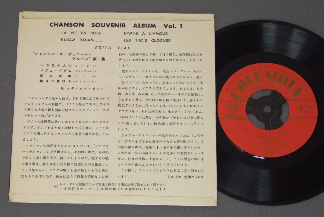 EDITH PIAFエディット・ピアフ/CHANSON SOUVENIR ALBUM VOL.1シャンソン・スーヴェニール・アルバム第1集 EM-139 製造国:日本盤 / Media:7inch外観:EX盤の状態:EX 価格(税込):¥524(売約済) 送料 7inch:定形外郵便 360円~LP:定形外郵便 660円~送料は、注文の最終画面で確認頂けます。 > > EDITH PIAF/CHANSON SOUVENIR ALBUM VOL.1 外観 (EX)特記事項:見開きや裏ジャケに日焼け感有り。見開きヘリ付近にテープ。外観EXの共通説明:ダメージが限定的。中古品としては保存状態がよい方。シミ、ヨゴレ、スレ 少し~軽度。 盤の状態 (EX)特記事項:薄いスリキズ・スレ少しある感じ。一見してきれいな印象です。盤EXの共通説明:盤面のスリキズが薄いものが少し~軽度 音に出そうなものは無いように見える(軽微なソフトティック音は除く)。 Tweet それぞれの画像をクリックすると、大きい写真が見られます こちらの商品もお勧めです 770円 BENNY GOODMANベニー・グッドマン他 / MR BENNY GOODMAN (BENNY GOODMAN STORY)映画ベニー・グッドマン物語 1,650円 MASARU IMADA今田勝 / MINT BREEZEミント・ブリーズ 1,210円 SONY CLARK TRIOソニー・クラーク・トリオ / SAME TITLEソニー・クラーク・トリオ 1,320円 EDDIE COSTA TRIOエディ・コスタ・トリオ / HOUSE OF BLUE LIGHTSハウス・オブ・ブルー・ライツ 1,210円 RANDY WESTON SEXTETランディー・ウエストン 六重奏団 / LITTLE NILESリトル・ナイルス - ランディー・ウエストンの芸術 770円 EDDIE JEFFERSONエディ・ジェファーソン / LETTER FROM HOMEレター・フロム・ホーム 1,650円 MODERN JAZZ QUARTETモダン・ジャズ・カルテット / CONCORDEコンコルド・デラックス 770円 RALPH SIMONラルフ・サイモン / TIME BEINGタイム・ビーイング