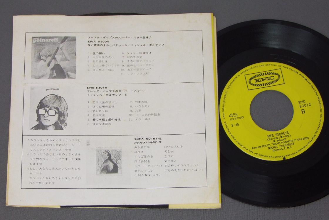 MICHEL POLNAREFFミッシェル・ポルナレフ/LOVE ME PLEASE LOVE ME愛の願い EPIC 83012 製造国:日本盤 / Media:7inch外観:EX-盤の状態:EX+ 価格(税込):¥550(売約済) 送料 7inch:定形外郵便 360円~LP:定形外郵便 660円~送料は、注文の最終画面で確認頂けます。 > > MICHEL POLNAREFF/LOVE ME PLEASE LOVE ME 外観 (EX-)特記事項:見開きや裏ジャケにシミ。右下にホッチキス穴。外観EX-の共通説明:ダメージ軽度~多少。 中古品としては普通の状態。シミ、ヨゴレ、スレなど軽く~多少。 盤の状態 (EX+)特記事項:極薄いスリキズ・スレ少し。一見してきれいな状態です。盤EX+の共通説明:盤面の極薄いスリキズ、スレ少し程度 音に出そうなものは無いように見える(極軽微なソフトティック音は除く)。 その他:※画像では確認できない、上下ヘリ、背表紙、取り出し口を中心に状態表記しております。画像で確認出来る表裏ジャケ、レーベルの状態表記は省いている場合がありますので、そちらの状態は画像でご確認をお願い致します。携帯の方は一度PC等で写真をご確認の上ご入札下さいますよう、お願い申し上げます。 Tweet それぞれの画像をクリックすると、大きい写真が見られます こちらの商品もお勧めです 770円 BOZ SCAGGSボズ・スキャッグス / DOWN TWO THEN LEFTダウン・トゥー・ゼン・レフト 660円 RODNEY CROWELLロドニー・クロウェル / BUT WHAT WILL THE NEIGHBORS THINKアメリカン・ヒーロー 1,320円 JONNY RIVERSジョニー・リバース / MISTER GO ! GO ! 60s ISSUEミスター・ゴー・ゴー ペラジャケ 1,320円 DAVID BLUEデイヴィッド・ブルー / CUPID`S ARROWキューピッズ・アロー 770円 PETER ALLENピーター・アレン / BI-COASTALバイ・コースタル 662円 RICK SPRINGFIELDリック・スプリングフィールド / SUCCESS HASN`T SPOILED ME YETアメリカン・ガール 770円 CHARLES AZNAVOURシャルル・アズナヴール / LA MAMMAラ・マンマ 770円 NEIL DIAMONDニール・ダイアモンド / RAINBOWレインボー