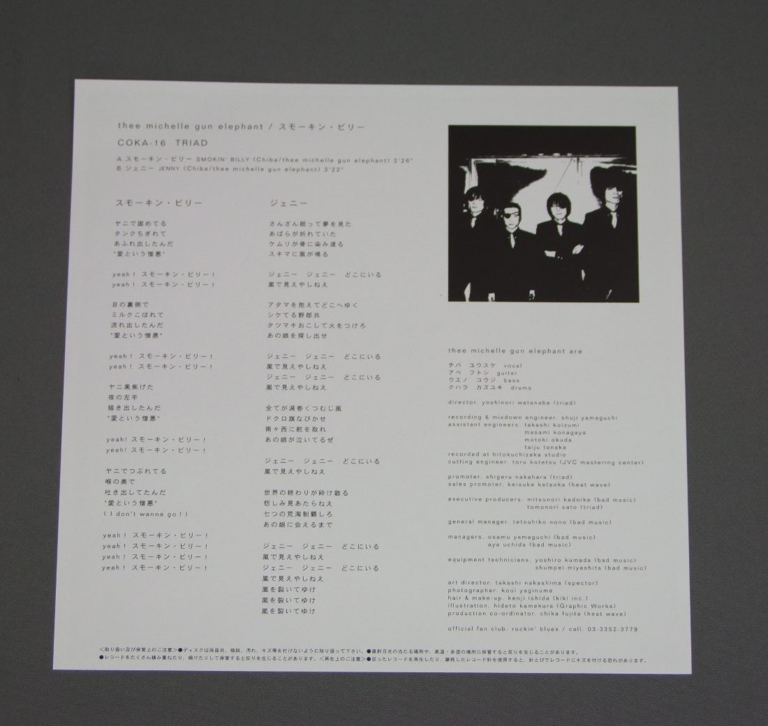 EMICHELLE GUN ELEPHANT/SMOKIN`BILLY COKA16 製造国:日本盤 / Media:7inch外観:EX+盤の状態:EX+ 価格(税込):¥1,047(売約済) 送料 7inch:定形外郵便 360円~LP:定形外郵便 660円~送料は、注文の最終画面で確認頂けます。 > > EMICHELLE GUN ELEPHANT/SMOKIN`BILLY 外観 (EX+)特記事項:特記無し。コンディションリストを参照下さい。外観EX+の共通説明:中古としては美品、一見してきれいでダメージが軽微。シミ、ヨゴレ、スレ有っても僅か~少し。 盤の状態 (EX+)特記事項:極薄いスリキズ・スレ少しだけ。一見してきれいな状態です。盤EX+の共通説明:盤面の極薄いスリキズ、スレ少し程度 音に出そうなものは無いように見える(極軽微なソフトティック音は除く)。 その他:※画像では確認できない、上下ヘリ、背表紙、取り出し口を中心に状態表記しております。画像で確認出来る表裏ジャケ、レーベルの状態表記は省いている場合がありますので、そちらの状態は画像でご確認をお願い致します。携帯の方は一度PC等で写真をご確認の上ご入札下さいますよう、お願い申し上げます。 Tweet それぞれの画像をクリックすると、大きい写真が見られます こちらの商品もお勧めです 990円 44 MAGUNAM44 マグナム / ACTOR 990円 44 MAGUNAM44 マグナム / DANGER MONEY 1,210円 PANTA & HALパンタ&HAL / TKO NIGHT LIGHT 1,980円 MODSモッズ / BLUE -MIDNIGHT HIGHWAY-夜のハイウェイ 770円 BOW WOWバウワウ / BOW WOWバウワウ 990円 44 MAGNUM / STREET ROCK`N ROLLERストリートロックンローラー 3,080円 JAPANES HEAVY METAL BANDS5th JAPAN HEAVY METAL FANTASY ( 1983 ) / 5th JAPAN HEAVY METAL FANTASY ( 1983 )グランド・メタル・ライヴ 770円 CAROLキャロル / CAROL FIRSTキャロル・ファースト