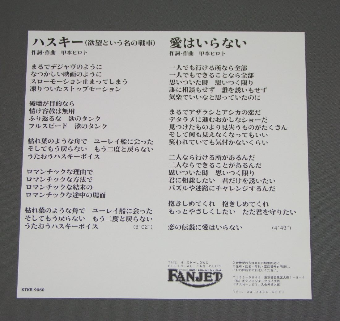 HIGH-LOWS/ハスキー欲望という名の戦車 KTKR9060 製造国:日本盤 / Media:7inch外観:EX+盤の状態:EX+ 価格(税込):¥1,257(売約済) 送料 7inch:定形外郵便 360円~LP:定形外郵便 660円~送料は、注文の最終画面で確認頂けます。 > > HIGH-LOWS/ 外観 (EX+)特記事項:特記無し。コンディションリストを参照下さい。外観EX+の共通説明:中古としては美品、一見してきれいでダメージが軽微。シミ、ヨゴレ、スレ有っても僅か~少し。 盤の状態 (EX+)特記事項:極薄いスリキズ・スレ少しだけ。一見してきれいな状態です。盤EX+の共通説明:盤面の極薄いスリキズ、スレ少し程度 音に出そうなものは無いように見える(極軽微なソフトティック音は除く)。 Tweet それぞれの画像をクリックすると、大きい写真が見られます こちらの商品もお勧めです 1,320円 GERARDジェラルド / GERARDジェラルド 3,300円 JOE YAMANAKAジョー山中 / TO THE NEW WORLD新しい世界へ 990円 44 MAGUNAM44 マグナム / DANGER MONEY 1,650円 MISAKO HONJOH本城未沙子 / DREAMERドリーマー 1,980円 MODSモッズ / BLUE -MIDNIGHT HIGHWAY-夜のハイウェイ 1,320円 COOLSクールス / COOLS LIVE VOLUME 2クールス・ライヴVOL 2 1,320円 CAROLキャロル / LAST LIVE 1975.4.13燃えつきる - キャロル・ラスト・ライヴ!! 1975.4.13 990円 44 MAGUNAM44 マグナム / ACTOR