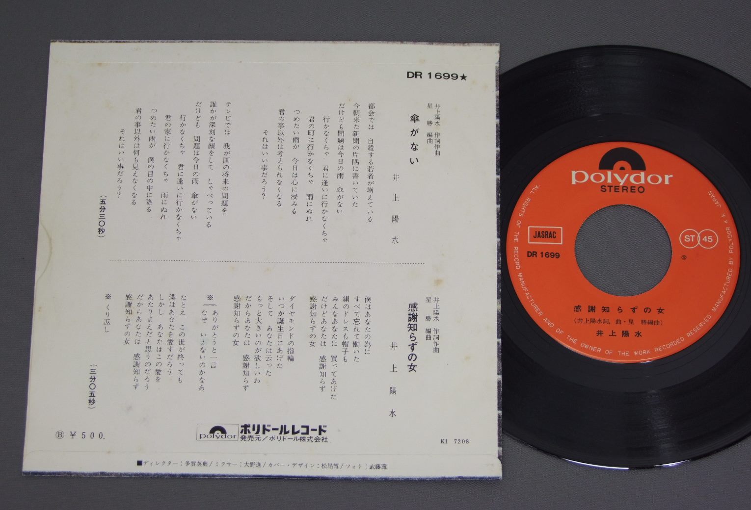 井上陽水/傘がない DR1699 製造国:日本盤 / Media:7inch外観:EX-盤の状態:EX 価格(税込):¥440(売約済) 送料 7inch:定形外郵便 360円~LP:定形外郵便 660円~送料は、注文の最終画面で確認頂けます。 > > / 外観 (EX-)特記事項:裏ジャケにシミ。外観EX-の共通説明:ダメージ軽度~多少。 中古品としては普通の状態。シミ、ヨゴレ、スレなど軽く~多少。 盤の状態 (EX)特記事項:薄いスリキズ・スレ少しある感じ。一見してきれいな印象です。盤EXの共通説明:盤面のスリキズが薄いものが少し~軽度 音に出そうなものは無いように見える(軽微なソフトティック音は除く)。 その他:※画像では確認できない、上下ヘリ、背表紙、取り出し口を中心に状態表記しております。画像で確認出来る表裏ジャケ、レーベルの状態表記は省いている場合がありますので、そちらの状態は画像でご確認をお願い致します。携帯の方は一度PC等で写真をご確認の上ご入札下さいますよう、お願い申し上げます。 Tweet それぞれの画像をクリックすると、大きい写真が見られます こちらの商品もお勧めです 440円 BILLY BANBANビリー・バンバン / BILLY BANBANビリー・バンバン 770円 HITOSHI KOMURO-TAKURO YOSHIDA etc小室等-吉田拓郎 他 / CHRISTMAS 990円 MINAMI RANBOみなみらんぼう / BEST COLLECTIONベスト・コレクション 人生と旅 770円 TAKASHI NISHIOKA西岡たかし / 1969-19781969-1978 西岡たかし 五つの赤い風船 2 770円 IRUKAイルカ / JULIAジュリア 770円 SHIGERU IZUMIYA泉谷しげる / GOLD RUSH黄金狂時代 1,760円 TAKASHI NISHIOKA西岡たかし / LIFEらいふ 1,320円 RYO KAGAWA加川良 / DEAR Q親愛なるQに捧ぐ