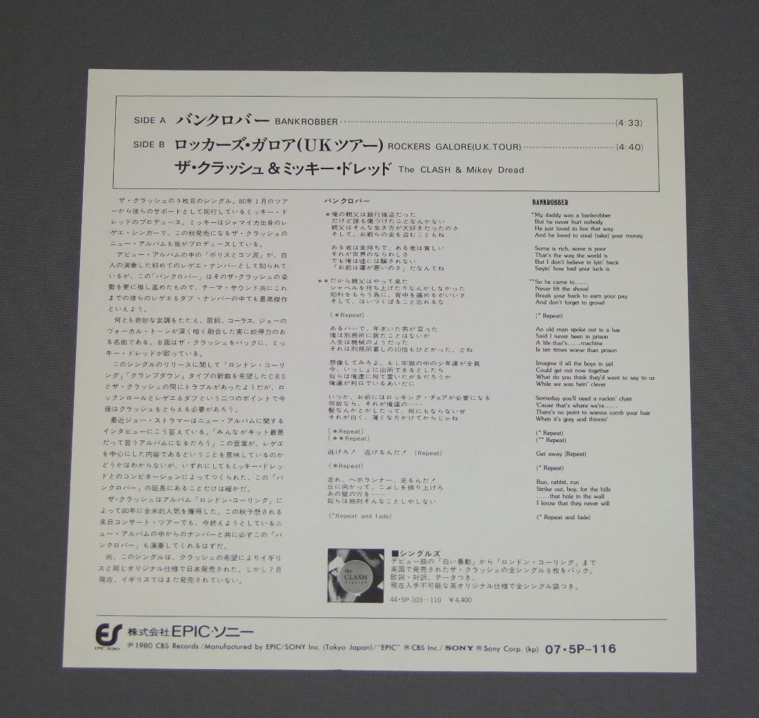 CLASH/BANK ROBBER 075P116 製造国:日本盤 / Media:7inch外観:EX盤の状態:EX+ 価格(税込):¥2,619(売約済) 送料 7inch:定形外郵便 360円~LP:定形外郵便 660円~送料は、注文の最終画面で確認頂けます。 > > CLASH/BANK ROBBER 外観 (EX)特記事項:表ジャケに薄い日焼け感軽少し有る感じ。外観EXの共通説明:ダメージが限定的。中古品としては保存状態がよい方。シミ、ヨゴレ、スレ 少し~軽度。 盤の状態 (EX+)特記事項:薄いスリキズ・スレ少し。一見してきれいな状態です。盤EX+の共通説明:盤面の極薄いスリキズ、スレ少し程度 音に出そうなものは無いように見える(極軽微なソフトティック音は除く)。 その他:※画像では確認できない、上下ヘリ、背表紙、取り出し口を中心に状態表記しております。画像で確認出来る表裏ジャケ、レーベルの状態表記は省いている場合がありますので、そちらの状態は画像でご確認をお願い致します。携帯の方は一度PC等で写真をご確認の上ご入札下さいますよう、お願い申し上げます。 Tweet それぞれの画像をクリックすると、大きい写真が見られます こちらの商品もお勧めです 440円 TUBESチューブス / OUTSIDE INSIDEアウトサイド・インサイド 1,320円 CULTURE CLUBカルチャー・クラブ / COLOUR BY NUMBERSカラー・バイ・ナンバーズ 1,320円 DOOL BY DOOLドール・バイ・ドール / GYPSY BLOODジプシー・ブラッド 1,320円 ADAM AND THE ANTSアダム&ジ・アンツ / KINGS OF THE WILD FRONTIERアダムの王国 880円 SNIFF `N` THE TEARSスニッフ&ザ・ティアーズ / LOVE ACTION夜の眩暈 770円 ADAM AND THE ANTS / KINGS OF THE WILD FRONTIER 770円 BOOMTOWN RATSブームタウン・ラッツ / MONDO BONGOモンド・ボンゴ 1,650円 BLONDIEブロンディ / EAT TO THE BEAT恋のハートビート