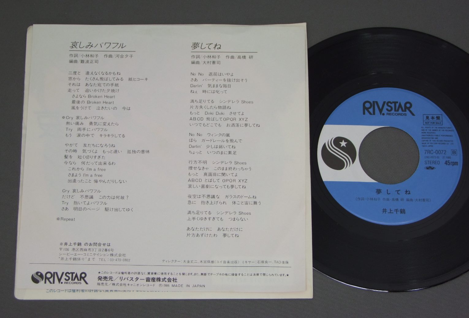井上千鶴/哀しみパワフル 7RC0072 製造国:日本盤 / Media:7inch外観:EX盤の状態:EX+ 価格(税込):¥524(売約済) 送料 7inch:定形外郵便 360円~LP:定形外郵便 660円~送料は、注文の最終画面で確認頂けます。 > > / 外観 (EX)特記事項:特記無し。コンディションリストを参照下さい。外観EXの共通説明:ダメージが限定的。中古品としては保存状態がよい方。シミ、ヨゴレ、スレ 少し~軽度。 盤の状態 (EX+)特記事項:極薄いスリキズ・スレ少しだけ。一見してきれいな状態です。盤EX+の共通説明:盤面の極薄いスリキズ、スレ少し程度 音に出そうなものは無いように見える(極軽微なソフトティック音は除く)。 その他:見本盤 Tweet それぞれの画像をクリックすると、大きい写真が見られます こちらの商品もお勧めです 770円 TSUKASA ITOH伊藤つかさ / TSUKASA IN WONDERLANDふしぎの国のつかさ 770円 MIKI ASAKURA麻倉未希 / DANCIN` M. 1,210円 HIROMI IWASAKI岩崎宏美 / ROMANTIC CONCERT 2ロマンティック・コンサート2 + ピンナップ付 440円 ERI E-AREA新田恵利 / ERI E-AREA 1,210円 SAYURI KOKUSHO国生さゆり / TRANSIT 770円 YUKO ISHIKAWA石川優子 / REN`AI-KODOKU-JIN恋愛孤独人 660円 TOSHIRO OHMI近江俊郎 / BEST COLLECTION懐かしの歌声デラックス 湯の町エレジー 1,320円 MAKO ISHINO石野真子 / MY COLLECTIONマイ・コレクション