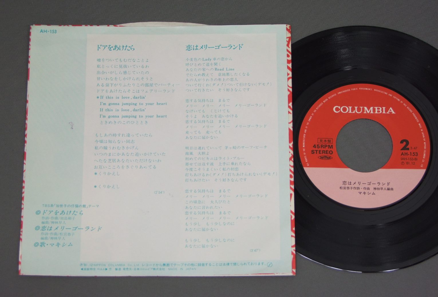 MAXIMマキシム/ドアをあけたら AH153 製造国:日本盤 / Media:7inch外観:EX盤の状態:EX 価格(税込):¥524(売約済) 送料 7inch:定形外郵便 360円~LP:定形外郵便 660円~送料は、注文の最終画面で確認頂けます。 > > MAXIM/ 外観 (EX)特記事項:特記無し。コンディションリストを参照下さい。外観EXの共通説明:ダメージが限定的。中古品としては保存状態がよい方。シミ、ヨゴレ、スレ 少し~軽度。 盤の状態 (EX)特記事項:薄いスリキズ・スレ軽くある感じ。ほとんどが軽微なものの様子です。盤EXの共通説明:盤面のスリキズが薄いものが少し~軽度 音に出そうなものは無いように見える(軽微なソフトティック音は除く)。 その他:見本盤 Tweet それぞれの画像をクリックすると、大きい写真が見られます こちらの商品もお勧めです 1,320円 YOSHIMI IWASAKI岩崎良美 / RING-A-DING (1st ALBUM)リング・ア・ディング (1st ALBUM) 990円 SONOKO KAWAI河合その子 / SIESTAシエスタ 990円 SONOKO KAWAI河合その子 / SIESTAシエスタ 1,210円 SONOKO KAWAI河合その子 / SIESTAシエスタ 770円 YUKO ISHIKAWA石川優子 / REN`AI KODOKU-JIN恋愛孤独人 550円 CHIEMI堀ちえみ / KAZE NO SASAYAKI風のささやき 770円 SHOKO SAWADA沢田聖子 / POTENTIALポテンシャル 770円 ERI NITTA新田恵利 / ERI