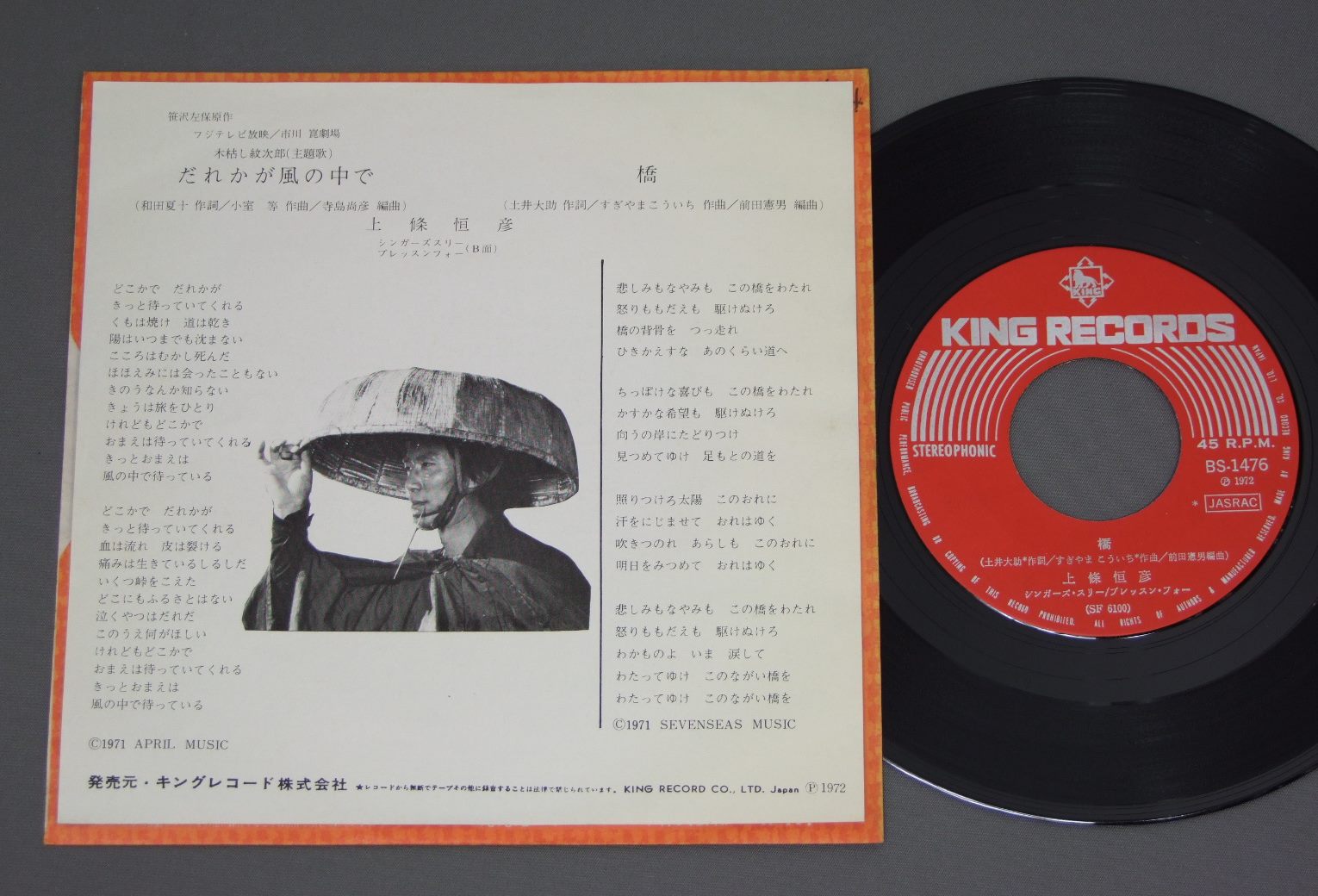 上條恒彦/木枯らし紋次郎主題歌 だれかが風の中で BS1476 製造国:日本盤 / Media:7inch外観:EX盤の状態:EX+ 価格(税込):¥524(売約済) 送料 7inch:定形外郵便 360円~LP:定形外郵便 660円~送料は、注文の最終画面で確認頂けます。 > > / 外観 (EX)特記事項:特記無し。コンディションリストを参照下さい。外観EXの共通説明:ダメージが限定的。中古品としては保存状態がよい方。シミ、ヨゴレ、スレ 少し~軽度。 盤の状態 (EX+)特記事項:極薄いスリキズ・スレ少し。一見してきれいな状態です。盤EX+の共通説明:盤面の極薄いスリキズ、スレ少し程度 音に出そうなものは無いように見える(極軽微なソフトティック音は除く)。 Tweet それぞれの画像をクリックすると、大きい写真が見られます こちらの商品もお勧めです 1,320円 HENRY MANCINIヘンリー・マンシーニ / SOUND TRACK CHARADEヘップバーン映画シャレード 1,320円 無声映画鑑賞会 / おお活動大写真 1,650円 TATSUYA TAKAHASHI & TOKYO UNION高橋達也と東京ユニオン / SOUND TRACK DAITOKAI大都会パート3 1,210円 JEANETTE MACDONALD NELSON EDDY etcジャネット・マクドナルド ネルソン・エディ 他 / 懐かしの映画主題曲集 770円 ORIGINAL SOUND TRACKオリジナル・サウンドトラック / SUPERMAN 2映画 スーパーマン2 冒険編 1,320円 JERRY GOLDSMITHジェリー・ゴールドスミス / STAR TREK THE MOTION PICTUREスター・トレック 1,210円 BRUCE LEEブルース・リー / IN THE BIG BOSSサントラ・ドラゴン危機一発 880円 JOHN ADDISONジョン・アディスン / SOUNDTRACK BRIDGE TOO FAR映画 遠すぎた橋