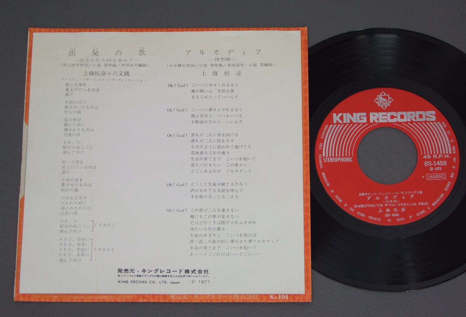 上條恒彦と六文銭/出発の歌 BS1458 製造国:日本盤 / Media:7inch外観:EX盤の状態:EX 価格(税込):¥440(売約済) 送料 7inch:定形外郵便 360円~LP:定形外郵便 660円~送料は、注文の最終画面で確認頂けます。 > > / 外観 (EX)特記事項:裏ジャケ側に多少薄い日焼け感軽有る感じ。外観EXの共通説明:ダメージが限定的。中古品としては保存状態がよい方。シミ、ヨゴレ、スレ 少し~軽度。 盤の状態 (EX)特記事項:薄いスリキズ・スレ軽くある感じ。軽微なものの様子です。盤EXの共通説明:盤面のスリキズが薄いものが少し~軽度 音に出そうなものは無いように見える(軽微なソフトティック音は除く)。 その他:※画像では確認できない、上下ヘリ、背表紙、取り出し口を中心に状態表記しております。画像で確認出来る表裏ジャケ、レーベルの状態表記は省いている場合がありますので、そちらの状態は画像でご確認をお願い致します。携帯の方は一度PC等で写真をご確認の上ご入札下さいますよう、お願い申し上げます。 Tweet それぞれの画像をクリックすると、大きい写真が見られます こちらの商品もお勧めです 1,210円 IRUKAイルカ / LOOP CHILD + FLEXI DISCループチャイルド+ソノシート 1,320円 MIMI HIYOSHI日吉ミミ / NORTHBOUND北帰行 - 日吉ミミの詩情 2,200円 YUTAKA SADOYAMA佐渡山豊 / MOTTO CHIKAKUHEもっと近くへ 1,980円 JIRO`Sジローズ / BRAND NEW SONGS JORO`S 2新しい唄 ジローズ 2 1,650円 5 BALLOONS五つの赤い風船 / FAIRLY TALEおとぎばなし 1,980円 YUZO TOYAOTA豊田勇造 / LIVE拾得ライブ・走れアルマジロ 1,320円 HAKO YAMAZAKI山崎ハコ / AI IRO NO UTA藍色の詩 1,760円 FIVE BALLOONS五つの赤い風船 / 1st ALBUMフォーク・アルバム 第1集