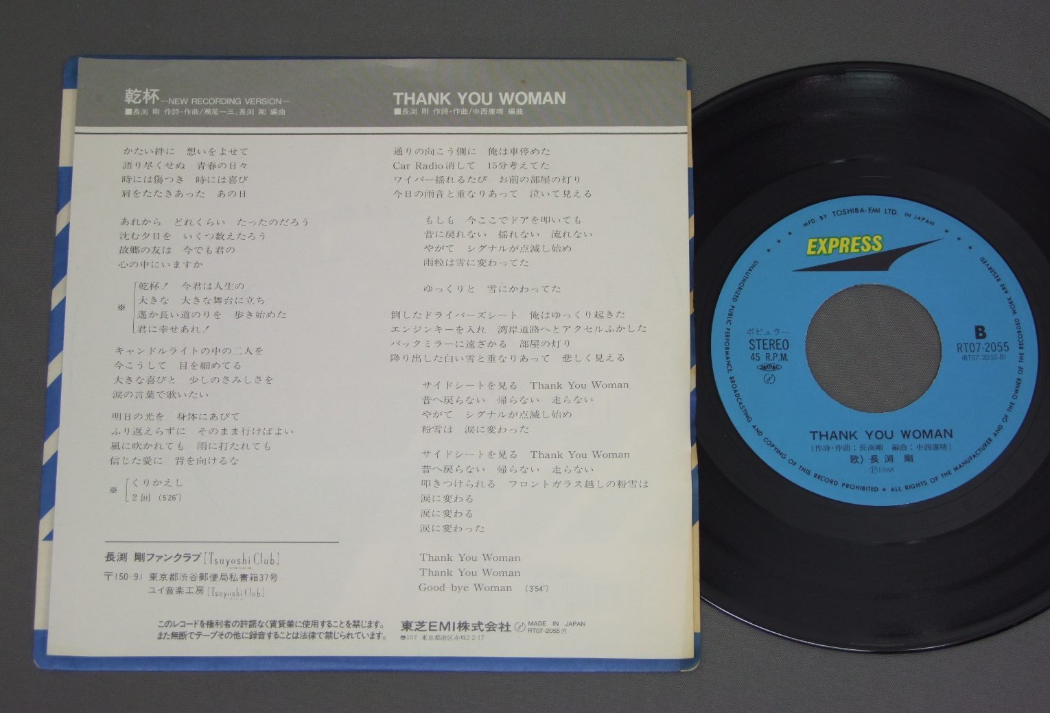 TSUYOSHI NAGABUCHI長渕剛/乾杯 RT072055 製造国:日本盤 / Media:7inch外観:EX盤の状態:EX+ 価格(税込):¥440(売約済) 送料 7inch:定形外郵便 360円~LP:定形外郵便 660円~送料は、注文の最終画面で確認頂けます。 > > TSUYOSHI NAGABUCHI/ 外観 (EX)特記事項:特記無し。コンディションリストを参照下さい。外観EXの共通説明:ダメージが限定的。中古品としては保存状態がよい方。シミ、ヨゴレ、スレ 少し~軽度。 盤の状態 (EX+)特記事項:極薄いスリキズ・スレ少し。一見してきれいな状態です。盤EX+の共通説明:盤面の極薄いスリキズ、スレ少し程度 音に出そうなものは無いように見える(極軽微なソフトティック音は除く)。 その他:※画像では確認できない、上下ヘリ、背表紙、取り出し口を中心に状態表記しております。画像で確認出来る表裏ジャケ、レーベルの状態表記は省いている場合がありますので、そちらの状態は画像でご確認をお願い致します。携帯の方は一度PC等で写真をご確認の上ご入札下さいますよう、お願い申し上げます。 Tweet それぞれの画像をクリックすると、大きい写真が見られます こちらの商品もお勧めです 770円 YUMING松任谷由実 / RINCARNATIONリ・インカーネイション 1,650円 TAKAYUKI INOUE井上堯之 / DON`T DRINK THE WATER WATER MIND 2ドント・ドリンク・ザ・ウォーター(ウォーター・マインド2) 990円 TULIP - YUMI MATSUTOYA etcチューリップ - ユーミン他 / PROMO ONLY店頭演奏総合試聴盤 1,210円 CANDIESキャンディーズ / SOUSHUNPU 早春譜 990円 CAROLキャロル / 1975 4.13.1975 4.13. 770円 KAKIZAKI OPEN THE ROAD神埼・オン・ザ・ロード / OPEN MY ROAD 770円 YASUKO NAITOH内藤やす子 / NAINAI ZUKUSHIないないづくし 1,210円 SNAKEMAN SHOWスネークマン・ショー / SNAKEMAN SHOWスネークマン・ショー