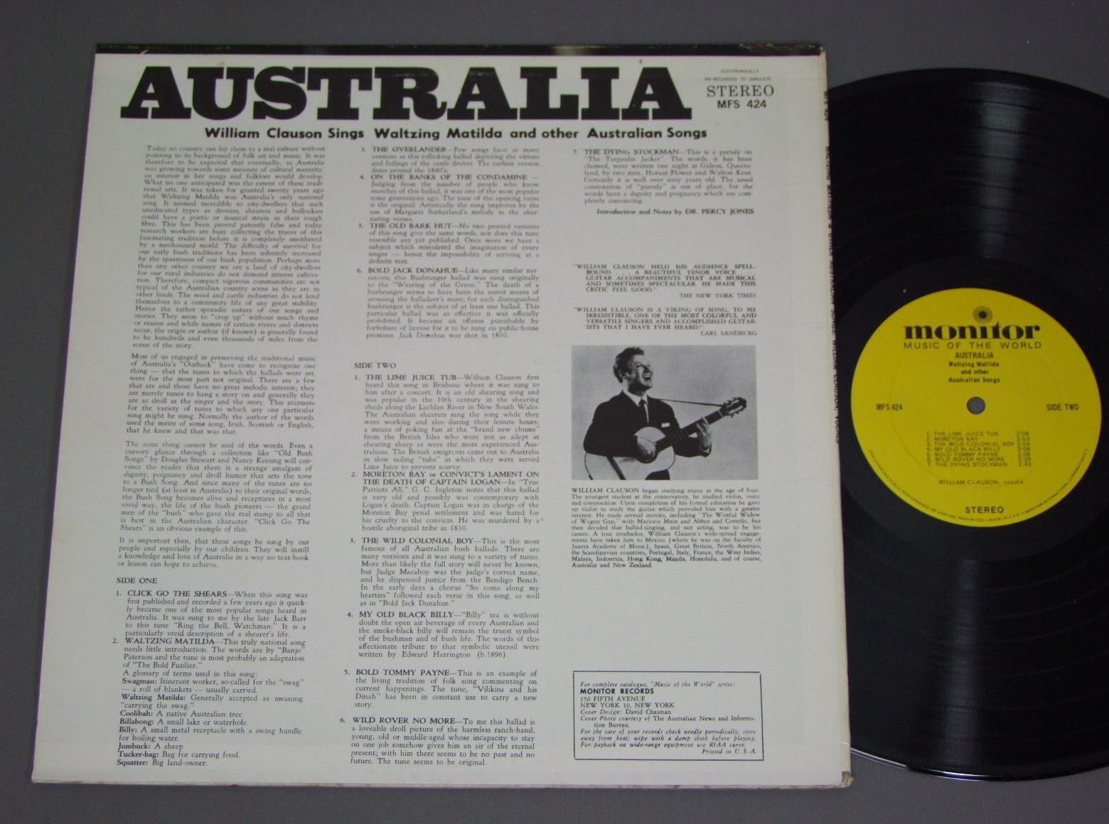 WILLIAM CLAUSON/SINGS WALTZING MATILDA AND OTHER AUSTRALLIAN SONGS MFS424 製造国:米国盤 / Media:LP外観:EX盤の状態:EX+ 価格(税込):¥550(売約済) 送料 7inch:定形外郵便 360円~LP:定形外郵便 660円~送料は、注文の最終画面で確認頂けます。 > > WILLIAM CLAUSON/SINGS WALTZING MATILDA AND OTHER AUSTRALLIAN SONGS 外観 (EX)特記事項:背や上下ヘリでスレ多少有り。外観EXの共通説明:ダメージが限定的。中古品としては保存状態がよい方。シミ、ヨゴレ、スレ 少し~軽度。 盤の状態 (EX+)特記事項:薄いスリキズ・スレ少し。一見してきれいな状態です。盤EX+の共通説明:盤面の極薄いスリキズ、スレ少し程度 音に出そうなものは無いように見える(極軽微なソフトティック音は除く)。 Tweet それぞれの画像をクリックすると、大きい写真が見られます こちらの商品もお勧めです 770円 WERNER LAMMERHIRT / DIE DRITTE 990円 CHARLIE RICH / FULLY REALIZED 770円 FINBAR & EDDIE FUREY / FINBAR & EDDIE FUREY VOL2 770円 CURT MALM / PROST LIEBE SEELE ! 770円 KINGSTON TRIO / WHERE HAVE ALL THE FLOWERS GONE? 770円 GEGEN DEN RHYTHMUS DER ZEIT / FRAUNHOFER SAITENMUSIK 990円 JIM MacLEOD AND HIS BAND / SOUND OF SCOTLAND 770円 CHRISTOF STAHLIN / LIEDER FUR ANDERE-TEXTE ZUR SCHALLPLATTE