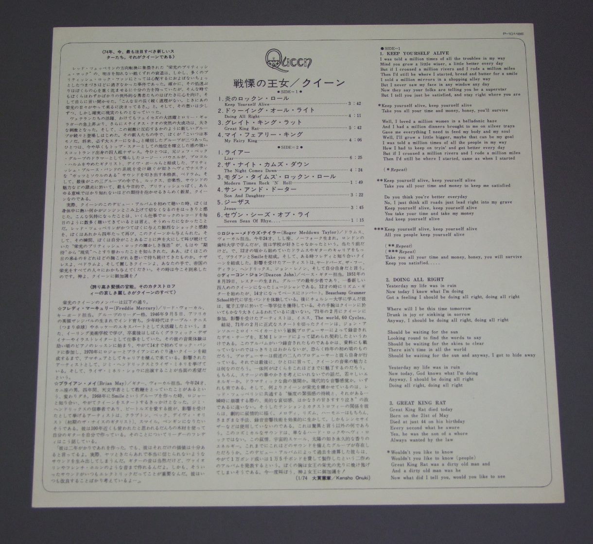 QUEENクイーン/1st ALBUM戦慄の王女 P10118E 製造国:日本盤 / Media:LP外観:EX-盤の状態:EX+帯:EX 価格(税込):¥1,572(売約済) 送料 7inch:定形外郵便 360円~LP:定形外郵便 660円~送料は、注文の最終画面で確認頂けます。 > > QUEEN/1st ALBUM 外観 (EX-)特記事項:背上下角でスレ。上下ヘリスレもやや有り。背スレも少し。外観EX-の共通説明:ダメージ軽度~多少。 中古品としては普通の状態。シミ、ヨゴレ、スレなど軽く~多少。 盤の状態 (EX+)特記事項:極薄いスリキズ・スレ少し。一見してきれいな状態です。盤EX+の共通説明:盤面の極薄いスリキズ、スレ少し程度 音に出そうなものは無いように見える(極軽微なソフトティック音は除く)。 帯の状態 (EX):ヨレ少し有り。 その他:※画像では確認できない、上下ヘリ、背表紙、取り出し口を中心に状態表記しております。画像で確認出来る表裏ジャケ、レーベルの状態表記は省いている場合がありますので、そちらの状態は画像でご確認をお願い致します。携帯の方は一度PC等で写真をご確認の上ご入札下さいますよう、お願い申し上げます。 Tweet それぞれの画像をクリックすると、大きい写真が見られます こちらの商品もお勧めです