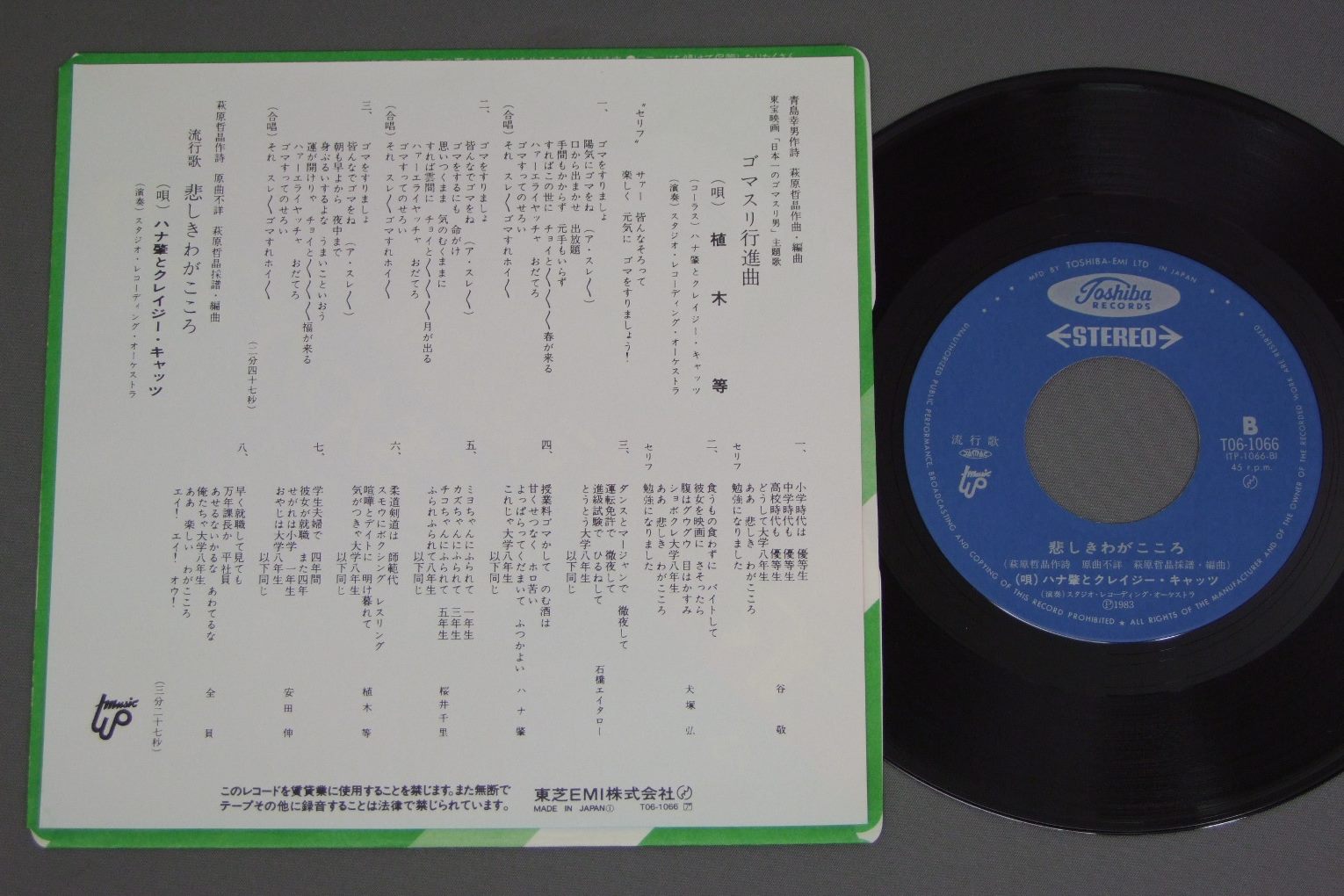 植木等/ ゴマスリ行進曲 再発盤 T06 1066 製造国:日本盤 / Media:7inch外観:EX+盤の状態:EX+ 価格(税込):¥550(売約済) 送料 7inch:定形外郵便 360円~LP:定形外郵便 660円~送料は、注文の最終画面で確認頂けます。 > > / 外観 (EX+)特記事項:あまりヨレやよごれ等は無い感じ外観EX+の共通説明:中古としては美品、一見してきれいでダメージが軽微。シミ、ヨゴレ、スレ有っても僅か~少し。 盤の状態 (EX+)特記事項:極薄いスリキズ・スレ少し。一見してきれいな状態です。盤EX+の共通説明:盤面の極薄いスリキズ、スレ少し程度 音に出そうなものは無いように見える(極軽微なソフトティック音は除く)。 その他:再発盤 Tweet それぞれの画像をクリックすると、大きい写真が見られます こちらの商品もお勧めです 990円 MARI AMACHI天地真理 / YOU&I小さな恋-ひとりじゃないの (あなたと私) 1,210円 PEDRO & CAPRICIOUSペドロ&カプリシャス / お気に召すまま 770円 KAKIZAKI OPEN THE ROAD神埼・オン・ザ・ロード / OPEN MY ROAD 1,210円 AKIRA KOBAYASHI小林旭 / マイトガイ・ゴールデン・ヒット 990円 EIKICHI YAZAWA矢沢永吉 / LIVE KORAKUEN STADIUMLIVE後楽園スタジアム 770円 ALL NIGHTERSオールナイターズ / 2nd ALBUMKIRAっとジェネレーション 1,320円 TAKAKO SHIRAI白井貴子 / PRINCESS NIGHTプリンセスナイト 770円 KAZE風 / WINDLESS BLUE
