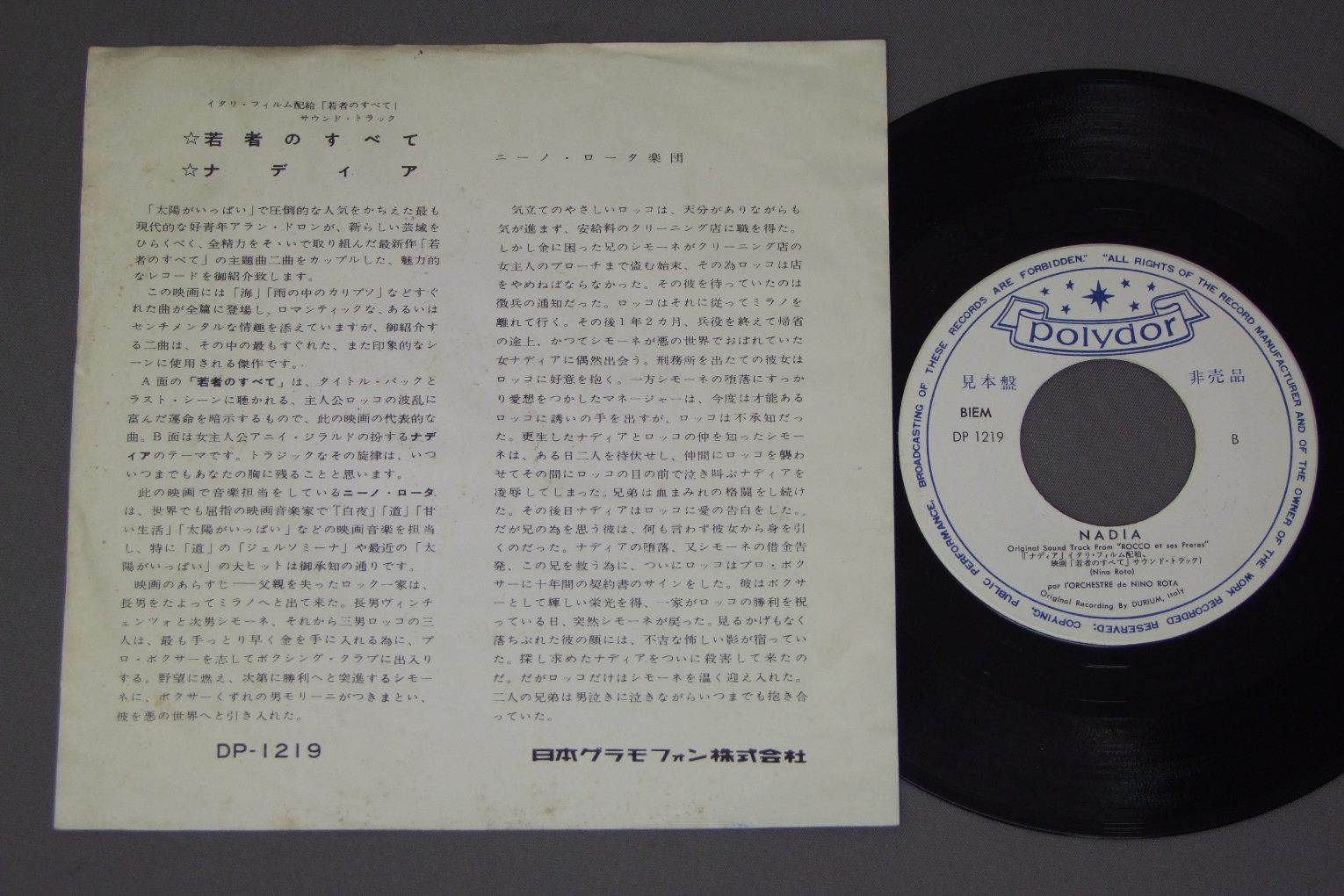 NADIAナデイア/PAESE MIO若者のすべて DP1219 製造国:日本盤 / Media:7inch外観:VG+盤の状態:EX 価格(税込):¥734(売約済) 送料 7inch:定形外郵便 360円~LP:定形外郵便 660円~送料は、注文の最終画面で確認頂けます。 > > NADIA/PAESE MIO 外観 (VG+)特記事項:ヨレやや有り。裏ジャケ側右にシミ或いはウオーターダメージ外観VG+の共通説明:ダメージやや有り。シミ、ヨゴレ、スレなど多少~やや多め。 盤の状態 (EX)特記事項:薄いスリキズ・スレ軽くある感じ。一見してきれいな印象です。盤EXの共通説明:盤面のスリキズが薄いものが少し~軽度 音に出そうなものは無いように見える(軽微なソフトティック音は除く)。 その他:白見本盤 Tweet それぞれの画像をクリックすると、大きい写真が見られます こちらの商品もお勧めです 1,210円 ANIME AONI PPRODUCTION青二プロ / VOICE VOICE VOICE10周年記念フェスティバル・ライヴ 770円 AMI-LAST CALL亜美・ラストコール / CREAM LEMON IMAGE ALBUMクリームレモン 440円 TALIZMANタリスマン / SUPERMAN LOCKロック組曲 超人ロック 1,650円 ANIME SYBORG 009アニメ サイボーグ009 / TV ORIGINAL SOUNDTRACKテレビ・オリジナル・サウンドトラック 770円 ROUND-VERNIAN VIFAM銀河漂流バイファム / ORIGINAL SOUND TRACK音楽集 770円 CRUSHER JOEクラッシャージョウ / SYMPHONIC SUITE交響組曲 1,650円 ANIME URUSEI YATSURA 3うる星やつら 3 / REMEMBER MY LOVEリメンバー・マイ・ラヴ 1,210円 SPACE BATTLE SHIP YAMATO宇宙戦艦ヤマト / SOUNDTRACK GOODBY YAMATOさらば宇宙戦艦ヤマト (愛の戦士たちドラマ編)