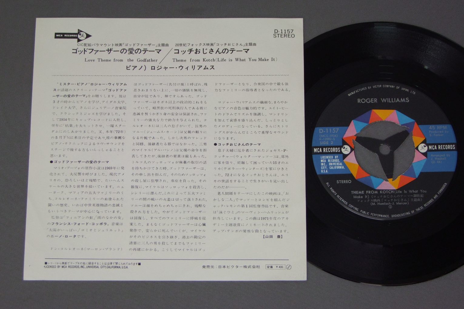 ROGER WILLIAMSロジャー・ウィリアムス/LOVE THEME FROM THE GODFATHERゴットファーザーの愛のテーマ D1157 製造国:日本盤 / Media:7inch外観:EX盤の状態:EX+ 価格(税込):¥330(売約済) 送料 7inch:定形外郵便 360円~LP:定形外郵便 660円~送料は、注文の最終画面で確認頂けます。 > > ROGER WILLIAMS/LOVE THEME FROM THE GODFATHER 外観 (EX)特記事項:下部に折れ目跡。右下にホッチキス穴。ヨレが多少有りますが、あまりよごれ等無い感じ。外観EXの共通説明:ダメージが限定的。中古品としては保存状態がよい方。シミ、ヨゴレ、スレ 少し~軽度。 盤の状態 (EX+)特記事項:薄いスリキズ・スレ少し。一見してきれいな状態です。盤EX+の共通説明:盤面の極薄いスリキズ、スレ少し程度 音に出そうなものは無いように見える(極軽微なソフトティック音は除く)。 Tweet それぞれの画像をクリックすると、大きい写真が見られます こちらの商品もお勧めです 2,530円 M.DIETRCH-L. HARVEY etcマレーネ・ディートリッヒ-リリアン・ハーヴェイ 他 / EUROPEAN CINEMA MUSIC OF GOLDEN AGE + POSTERSオリジナル盤による戦前欧羅巴映画主題歌集 ドイツ篇-フランス篇 ポスター付 770円 JOHN BARRYジョン・バリー / COTTON CLUB映画 コットンクラブ 1,650円 FRANCIS COPPOLAフランシス・コッポラ / SOUNDTRACK APOCALYPSE NOWサントラ 地獄の黙示録 990円 OLIVIA NEWTON-JOHN etcオリビア・ニュートンジョン他 / TWO OF A KINDサントラ・セカンド・チャンス 1,320円 IRWIN ALLENアーウィン・アレン作品 / TOWERING INFERNO映画タワーリング・インフェルノ 550円 BURT BACHARACHバート・バカラック / SOUNDTRACK ARTHUR映画 ミスター・アーサー 1,320円 JERRY GOLDSMITHジェリー・ゴールドスミス / STAR TREK THE MOTION PICTUREスター・トレック 1,320円 無声映画鑑賞会 / おお活動大写真