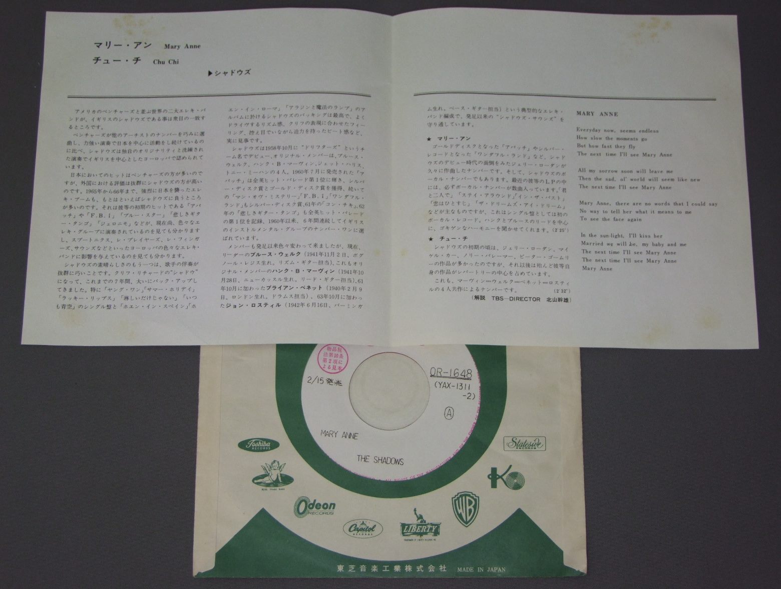 SHADOWSシャドウズ/MARY ANNEマリー・アン 白見本赤盤 OR1648 製造国:日本盤 / Media:7inch外観:EX盤の状態:EX+ 価格(税込):¥2,750(売約済) 送料 7inch:定形外郵便 360円~LP:定形外郵便 660円~送料は、注文の最終画面で確認頂けます。 > > SHADOWS/MARY ANNE 外観 (EX)特記事項:裏側や見開きに薄いシミ有り。背スレが少し。表側はヨレやよごれ等は少ない感じ。外観EXの共通説明:ダメージが限定的。中古品としては保存状態がよい方。シミ、ヨゴレ、スレ 少し~軽度。 盤の状態 (EX+)特記事項:薄いスリキズ・スレ少し。一見してきれいな状態です。盤EX+の共通説明:盤面の極薄いスリキズ、スレ少し程度 音に出そうなものは無いように見える(極軽微なソフトティック音は除く)。 その他:白見本盤 Tweet それぞれの画像をクリックすると、大きい写真が見られます こちらの商品もお勧めです 1,210円 ELVIS PRESLEY / ON STAGE FEBRUARY 1970プレスリー・オン・ステージ 1970 1,650円 ELVIS PLESLEYエルヴィス.プレスリー / ELVIS-THAT`S THE WAY IT ISエルヴィス.オン・ステージVOL.1 990円 RICK NELSONリック・ネルソン / ALBUM SEVEN BY RICKアルバム・セブン・バイ・リック 1,210円 VENTURES / BEST OF THE VENTURES vol.2 RED VINYL赤盤 770円 ELVIS PRESLEYエルヴィス・プレスリー / THAT`S THE WAY IT IS映画 エルヴィス・オン・ステージ 660円 PAUL ANKAポール・アンカ / BEST OF PAUL ANKAポール・アンカのすべて 440円 VENTURESベンチャーズ / POPS IN JAPANポップス・イン・ジャパン 880円 ELVISエルヴィス・プレスリー / THAT`S THE WAY IT ISこの胸のときめきを/映画「エルヴィス・オン・ステージ」主題歌集